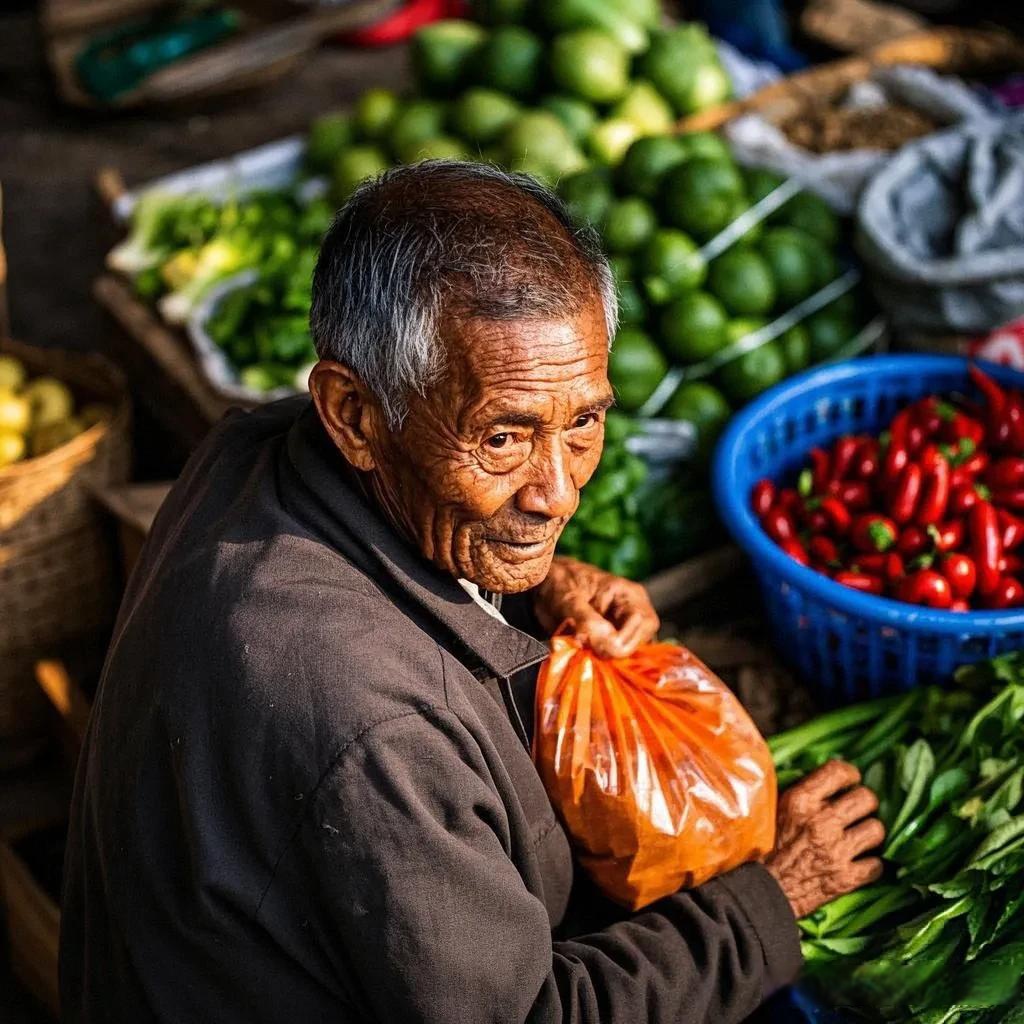 老人话不多,每次接过菜,只会说一句“谢谢”,然后就坐在菜市场角落的石凳上,慢慢整理手里的菜,有时候会看着来往的人发呆,一看就是一个多小时。