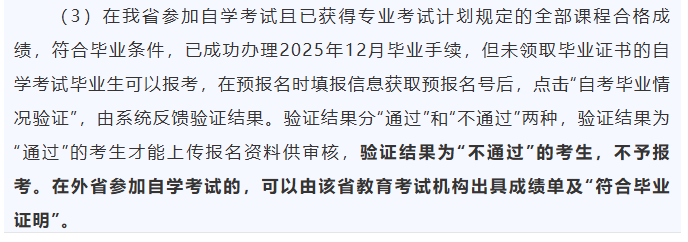 参加自学考试且已获得专业考试计划规定的全部课程合格成绩,符合毕业条件,已成功办理2025年12月毕业手续,但未领取毕业证书的自学考试毕业生可以报考,在预报名时填报信息获取预报名号后,点击“自考毕业情况验证”,由系统反馈验证结果。