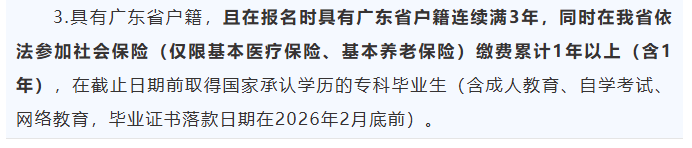具有广东省户籍,且在报名时具有广东省户籍连续满3年,同时在我省依法参加社会保险(仅限基本医疗保险、基本养老保险)缴费累计1年以上(含1年),在截止日期前取得国家承认学历的专科毕业生(含成人教育、自学考试、网络教育,毕业证书落款日期在2026年2月底前)。