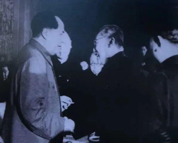 二十世纪五十年代中期,毛主席在约见工商界代表人物座谈时与胡厥文亲切握手。