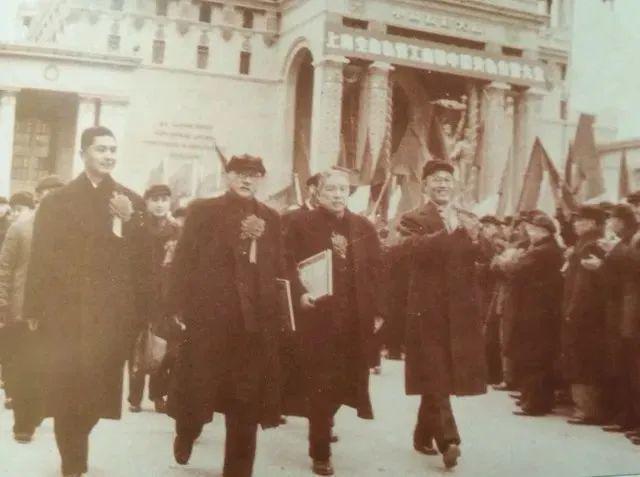 1956年1月20日,民建上海分会主任委员盛丕华、副主任委员胡厥文(左二)、荣毅仁带领工商界代表参加上海市资本主义工商业公私合营大会。
