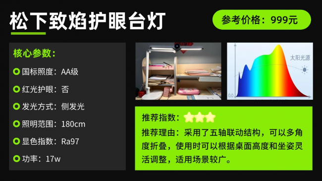 学生护眼灯哪个牌子最好?松下致焰护眼台灯采用17W全光谱灯珠,通过侧发光技术和导光板柔化光线,照明范围可覆盖约1.8米桌面,符合国AA级照度标准。显色指数Ra97,色彩还原表现较好,支持4000K-5000K色温调节,并配备智能感光功能,能根据环境光线自动调整亮度。底座采用触控面板,操作顺滑,支持多种照明模式切换。不过,这款台灯在光谱结构上存在明显不足,蓝光峰值达到0.8,虽然符合RG0标准但数值偏高,长时间使用可能增加眼睛负担。