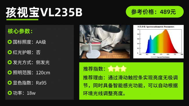 学生护眼灯哪个牌子最好?孩视宝VL235B护眼台灯的灯体用了航空铝材和ABS树脂的组合,稳固性还不错,但部分塑料部件摸起来质感很普通,没什么高级感。它的核心亮点是20.5cm的圆形大发光面,搭配面光源+环光源的设计,光线分布比较均匀,符合国AA级标准,日常读写基本不会有明显暗角,光线也比较柔和。功能上还算实用,有3900K、3650K、3400K、4150K四档固定色温可以选,适配阅读、学习等不同场景。不过它的部分转轴的阻尼感太强,调整灯头角度时得用点劲,手感有点生硬,不够顺滑。