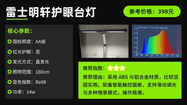 学生护眼灯哪个牌子最好?雷士明轩护眼台灯采用矩形发光面设计,长度约为42.1cm,其照明范围较广,可覆盖约1.8米的桌面区域。发光面内采用了梯田式透光板等结构,光线分布比较均匀。显色指数达到Ra98,能够较好地还原物体色彩。功能上支持智能感光,可自动调节亮度,并具备45分钟定时休息提醒等模式。不过,采用的是直发光设计,光线相对集中,在高亮度下可能会产生轻微眩光,且存在一定的频闪现象。此外,蓝光峰值达到0.8,在有害蓝光抑制方面表现中规中矩。