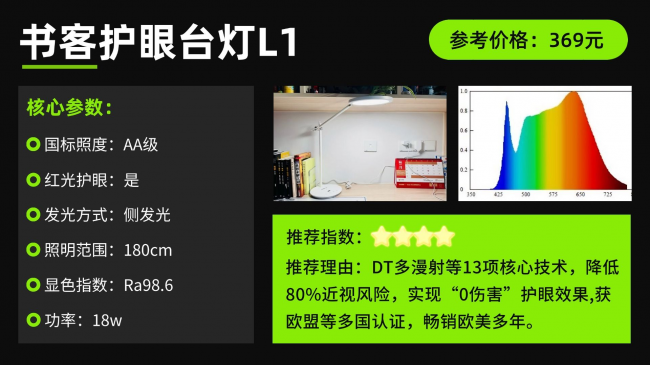 学生护眼灯推荐第五名:书客L1护眼台灯