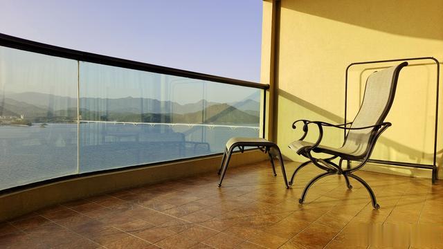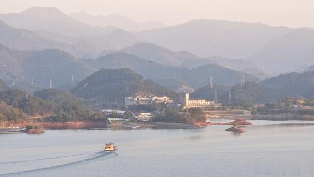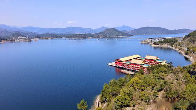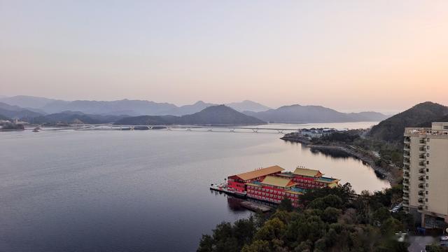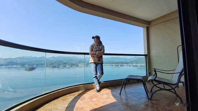 宽阔的阳台,视野绝佳。自左向右,像是拉开了一卷巨幅山水画。只见艳阳之下,千岛连绵,湖波潋滟。长达千米的千岛湖大桥,横跨湖上,宛如一道白练!当然,这仅仅只是千岛湖的一面。后续两天,我们又在此见识到它更多的风采。