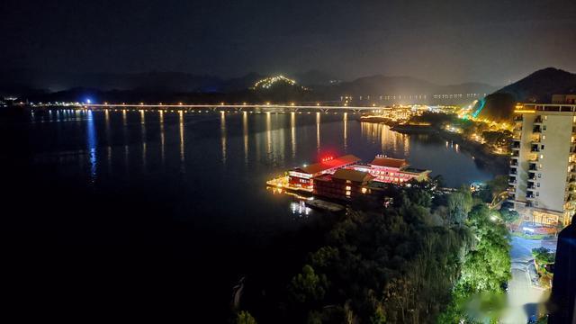 夜晚的湖面,则是一片黢黑,沉静如墨。晚风习习中,远眺千岛湖大桥和沿岸的点点灯火,尘嚣淡去,宁静悠远,身与心都得到了极大的放松。