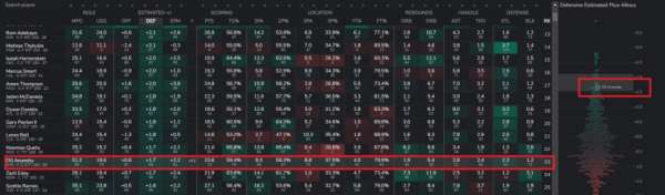 另外他在防守端还有一个重要价值就是全能防守属性,能从1号位防到五号位,出色的换防能力可以使对手的高个挡拆战术威力大减,放上他的对位防守数据.