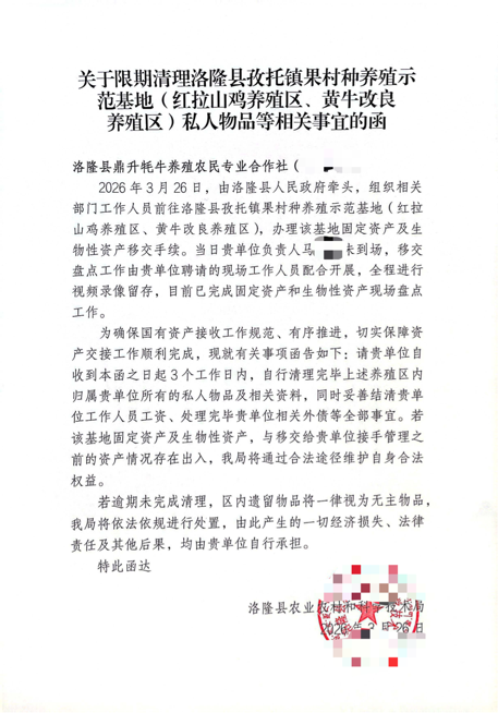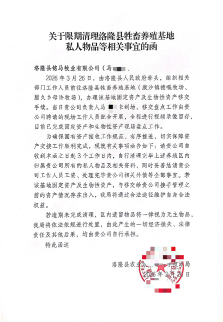 相关部门曾清点牲畜,7、8月份左右首次清点时,确认死亡66头,截至目前,累计死亡已达100余头,但双方未就死亡原因、补偿事宜沟通,未明确责任划分及核算标准。此后,相关部门复函要求提供投入明细,却未明确核算标准及支付时限;2026年3月26日,洛隆县农业农村单位更是直接发函,要求马先生名下的鼎升牦牛养殖农民专业合作社及铭马牧业有限公司,在3个工作日内清理完各养殖区私人物品、结清工资外债并完成移交,否则将依法处置遗留物品,却只字未提代管补偿相关事宜,反而以追责相逼。马先生因担心移交后投入无法核算而未配合,企业债务加剧,债权人纷纷维权,运营彻底停滞。