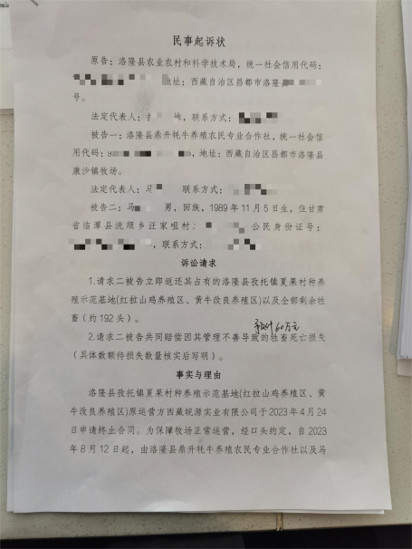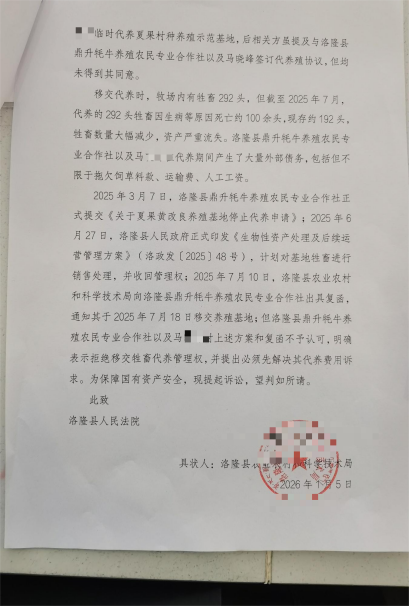 垫资500余万替当地行政单位代管公有牧场近三年,换来的不是补偿,而是60万元的起诉索赔、100余头牛死亡,还有妻子在老家收购饲草途中遭遇交通事故离世、尊辈徐某义患癌无钱医治的绝境——这是昌都市洛隆县鼎升牦牛养殖农民专业合作社负责人马先生的真实遭遇。其团队应洛隆县农业农村和科学技术单位(下称“县农业农村单位”)请求,接手夏果牧场应急代管,本是口头约定临时代管数日,却被相关部门一拖就是近三年,始终不落实交接、不解决垫资问题,在付出巨大成本后陷入多重困境,目前相关部门对代管事宜仅作形式性回应,未开展实质性沟通解决,纠纷陷入僵局,相关事宜亟待协调解决。