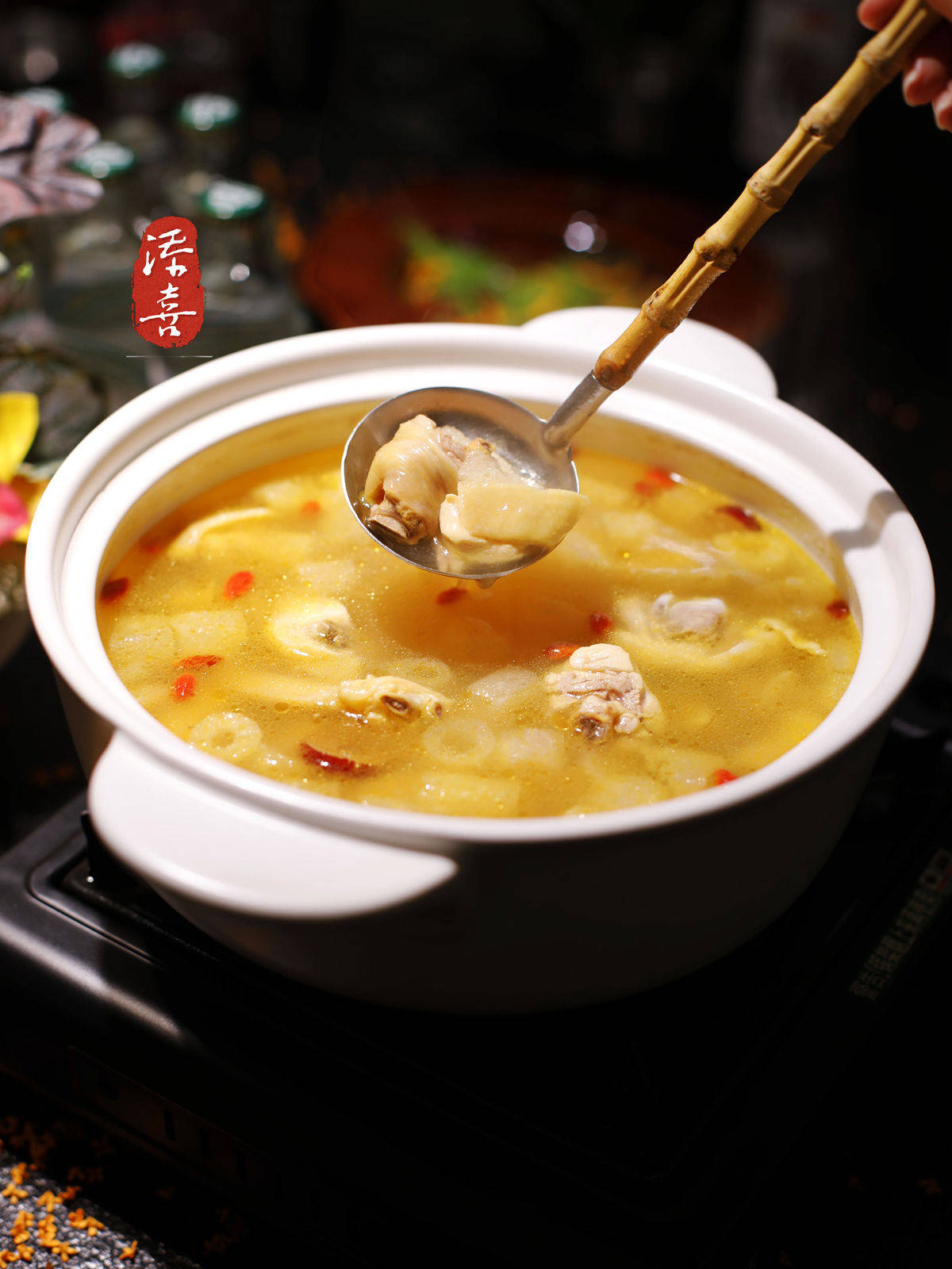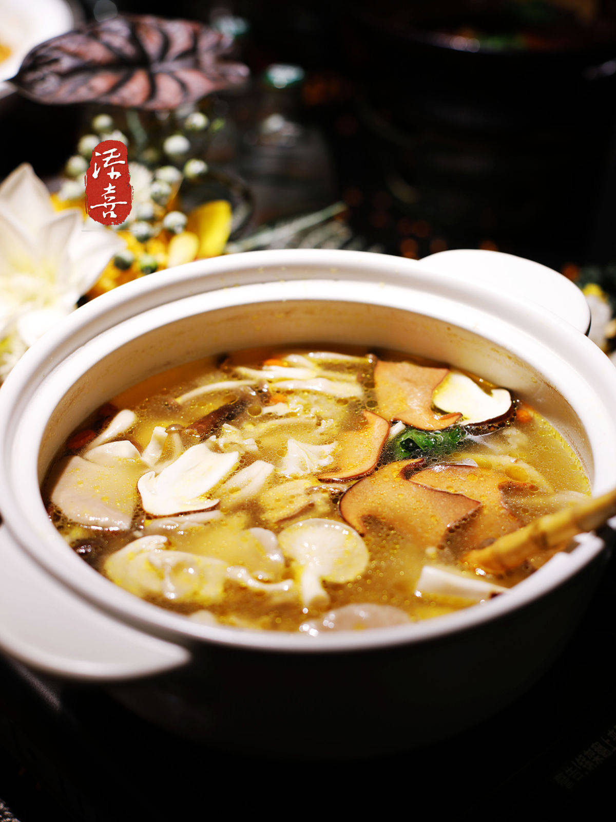精选临安跑山鸡,与三年陈绍兴花雕相遇,配比历经数百次调试,方成这一锅金黄清亮的汤底。经四小时文火慢吊,汤色清润,香气醇和。锅中竹荪吸饱汤汁,脆嫩可人,再以泰国柠檬的清新酸意点睛,平衡得恰到好处。上桌时,随煲附一篮时令菌菇与鲜蔬。等煲内的鸡汤沸起,先品一碗原汤,温润的酒香与鸡鲜瞬间唤醒味蕾。继而将菌菇入锅稍煮,待其吸尽汤底精华,入口更添一份山野的清甜与脆嫩。从汤到菜,层次渐次展开,风味绵长。