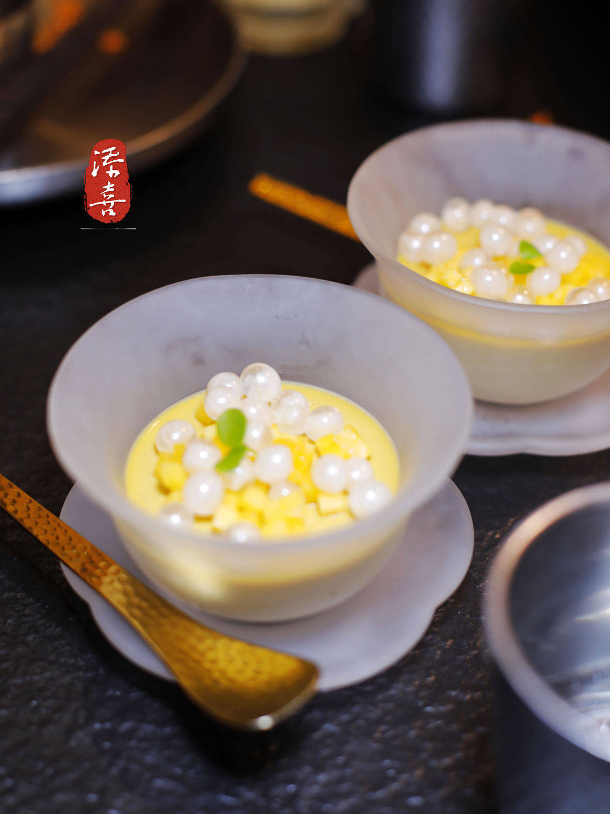 一盏清茶冻,盛在素白瓷盏中,形色温婉。以杭州龙井入茶冻,茶色清润,入口带着一缕江南春日的香气。茶冻滑嫩,其间缀着鲜芒果丁,清甜柔软;再添几颗马蹄爆珠,轻轻一咬,脆爽迸发。