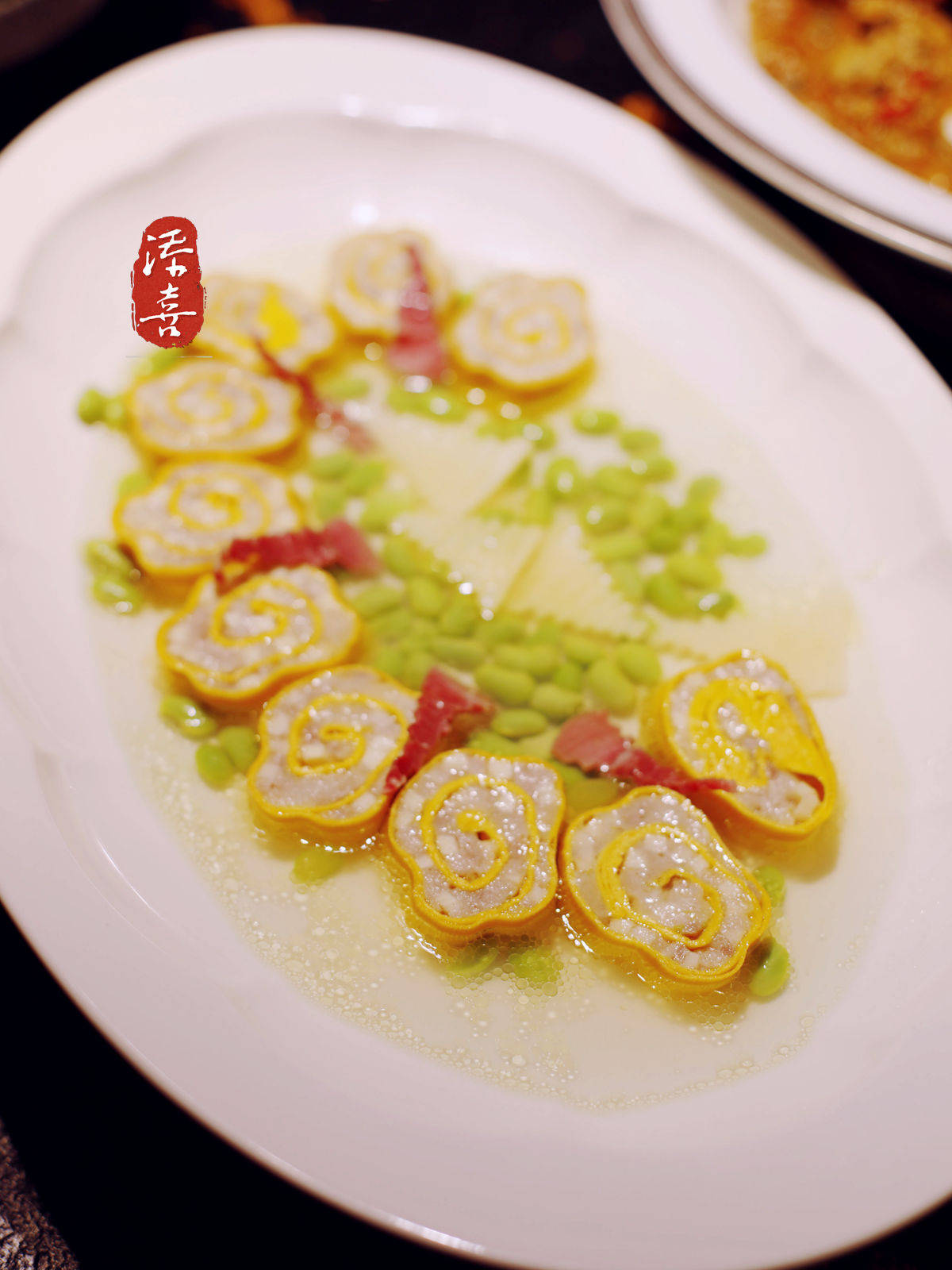 蛋皮香软,肉馅多汁,笋丁脆爽,三种口感在一口之间交融。肉馅精选四肥六瘦的黑猪肉,肥瘦得宜,鲜润不腻;拌入云南甜笋丁,清甜脆嫩,恰好化解肉的厚重。蛋皮用临安土鸡蛋摊制,色泽金黄,蛋香浓郁。以薄而不破的蛋皮裹紧肉馅,用粽叶与麻绳细心扎好,上笼蒸透。蒸汽中,粽叶的清香渐渐渗入内里。切开后,蛋皮柔嫩,肉馅鲜滑,咬到笋丁时“咔嚓”一声,更添趣味。粽香余韵隐约,整道菜清淡却滋味丰富,吃得落胃舒心。