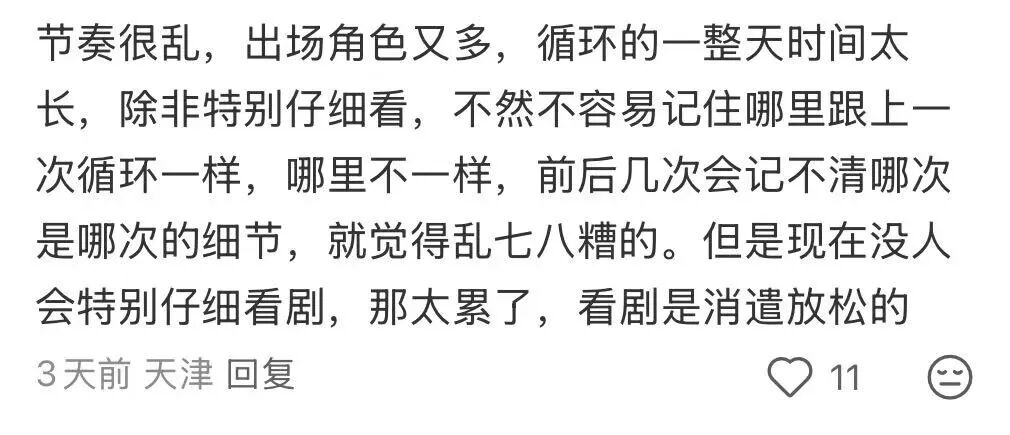 但此后《致命游戏》《19层》《滤镜》《在人间》等无限流设定作品涌现,而在悬疑剧赛道观众更是吃到了《漫长的季节》、《繁城之下》等细糠,《不眠日》播出时虽然打出“有限循环”的噱头,但观众的新鲜感已经大打折扣,再加上剧情极致又快节奏的短剧冲击,让不少观众被《不眠日》冗长墨迹的剧情劝退。