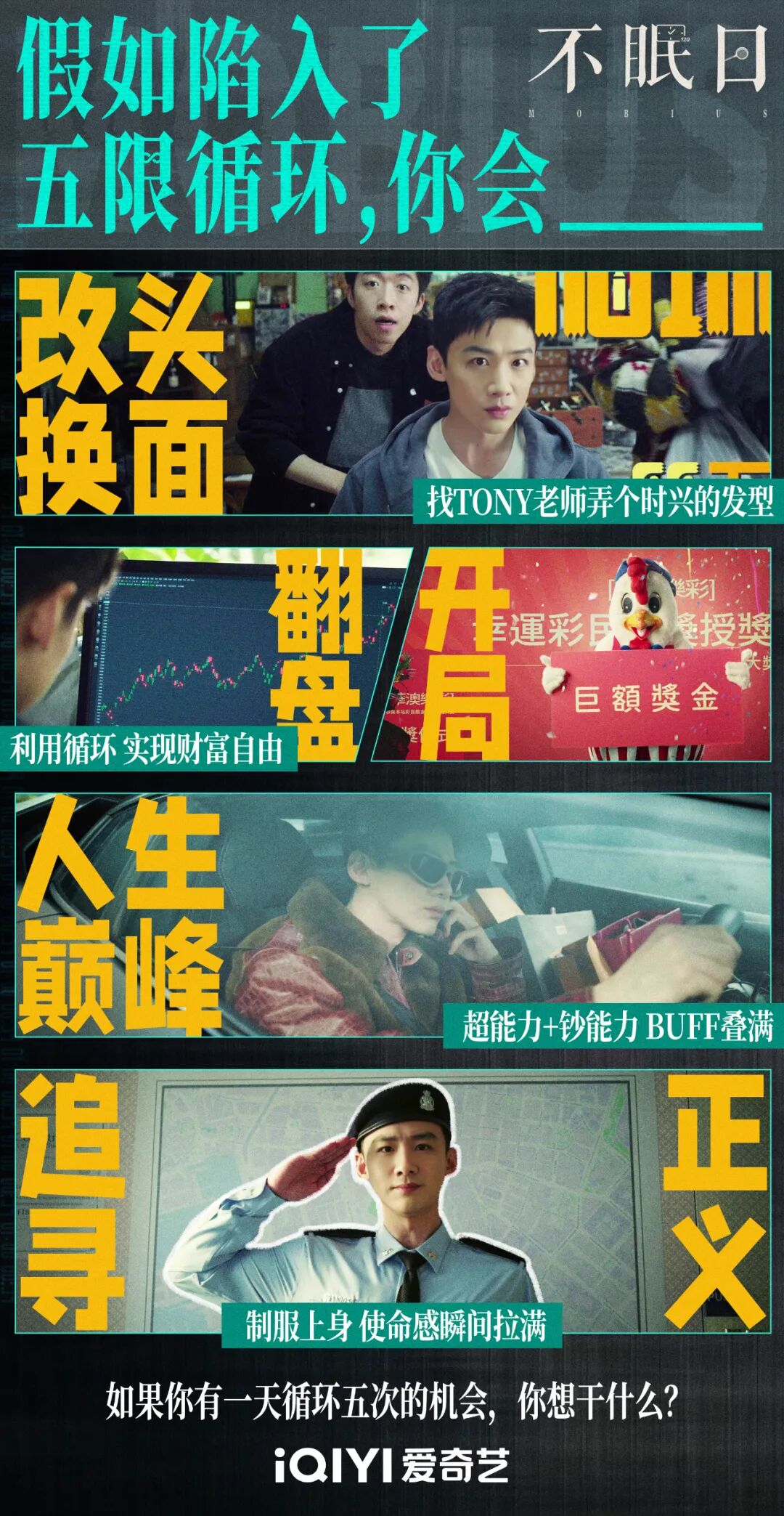 而白敬亭所饰演的刑警丁奇拥有一天能循环五次的超能力,通过一次次试验控制变量捋出线索,最终在第五次成功破解案件。