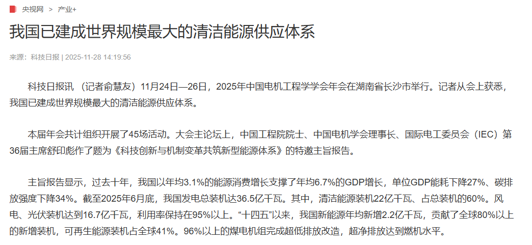 科技日报讯 (记者俞慧友)11月24日—26日,2025年中国电机工程学学会年会在湖南省长沙市举行。记者从会上获悉,我国已建成世界规模最大的清洁能源供应体系。