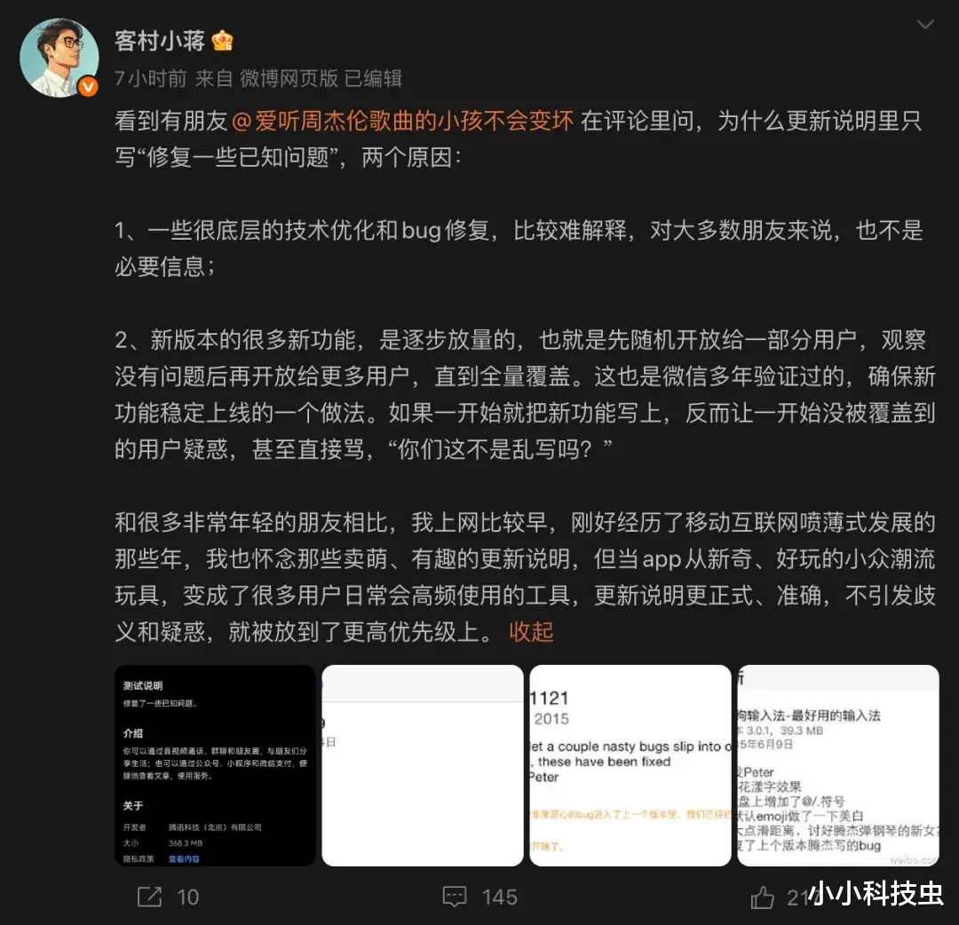 有员工回应讲:底层技术修复没法用大白话说清楚;新功能分批推送,写出来有人用不上反而容易误会。