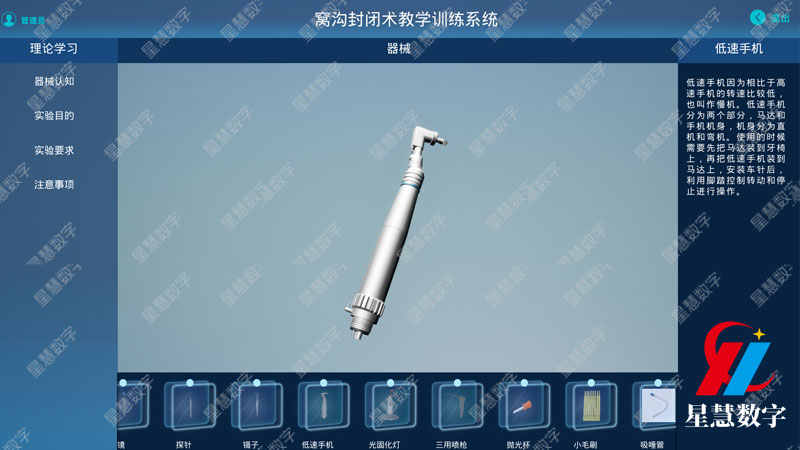 口腔数字化虚拟仿真平台通过高精度三维建模,精准还原每个步骤的细节:从器械选择,到清洁牙面和酸蚀处理,最后封闭和光固化与检查。窝沟封闭术虚拟教学训练系统还具有考核和实时评估功能,不但在练习时可以实时提醒,还可在考核时量化操作误差,帮助学生针对性改进。