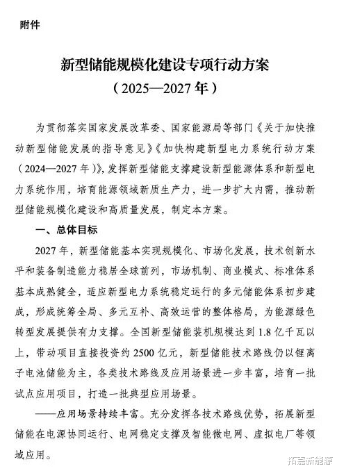 国家发改委、国家能源局联合发布的《新型储能规模化建设专项行动方案(2025—2027年)》明确提出:到2027年,全国新型储能装机规模突破 1.8亿千瓦,带动投资约 2500亿元,并形成可持续盈利的市场体系。