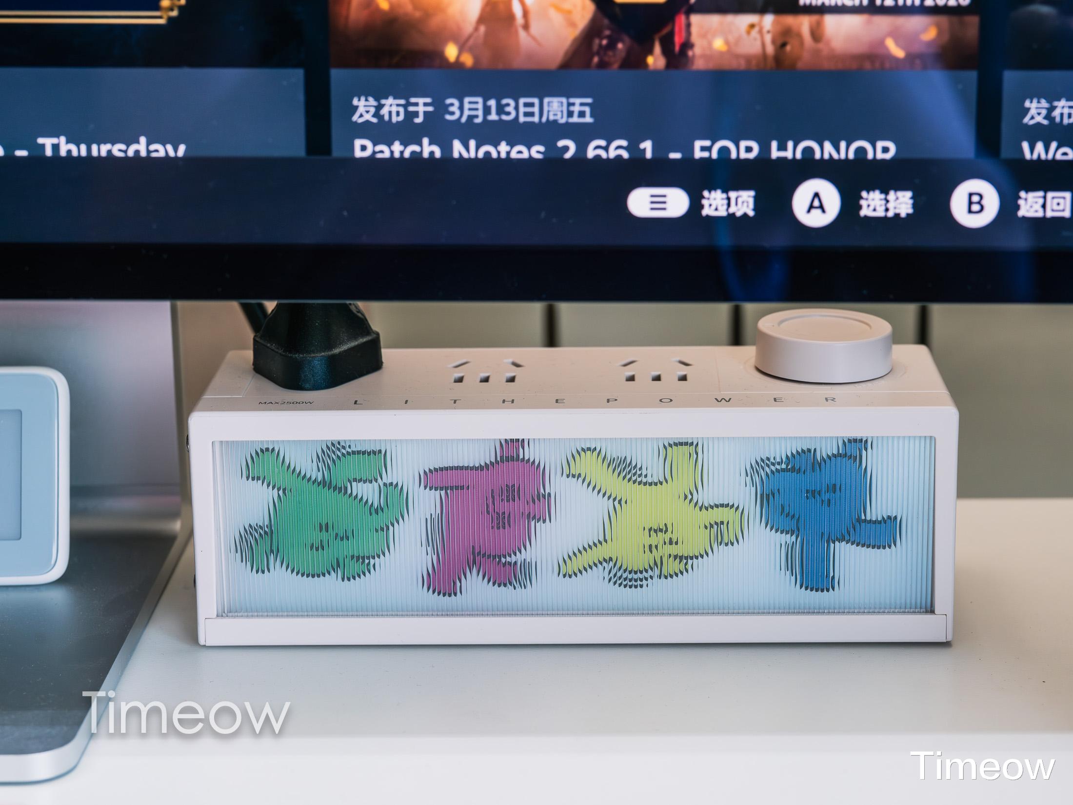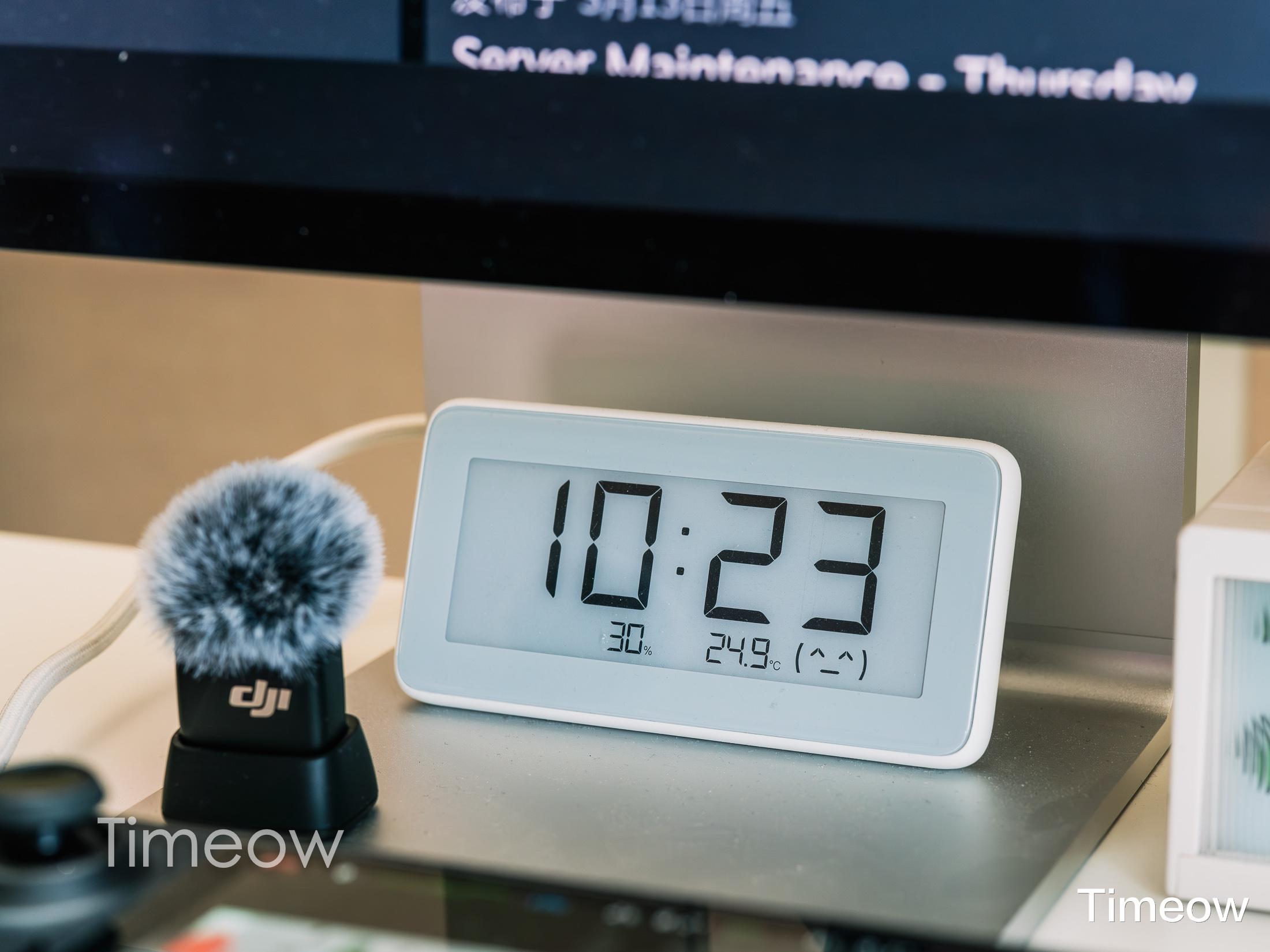 显示器下方还有一个低调的小东西,小米墨水屏温度计。墨水屏不发光不刺眼,可以显示时间、温度和湿度,这种极简设计我还是非常喜欢的。