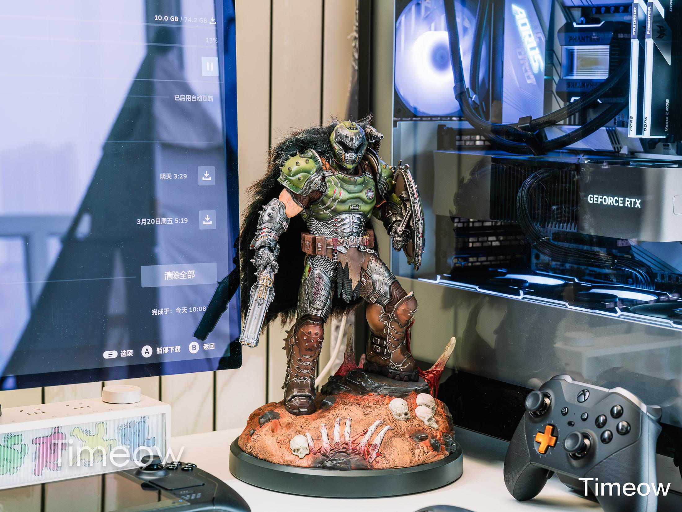 主机和显示器中间是我买的第一个大手办,这是我买的典藏版毁灭战士黑暗时代里的雕像,左手超级霰弹枪、右手盾牌,脚下踩着恶魔尸体,看起来还是很酷炫的。