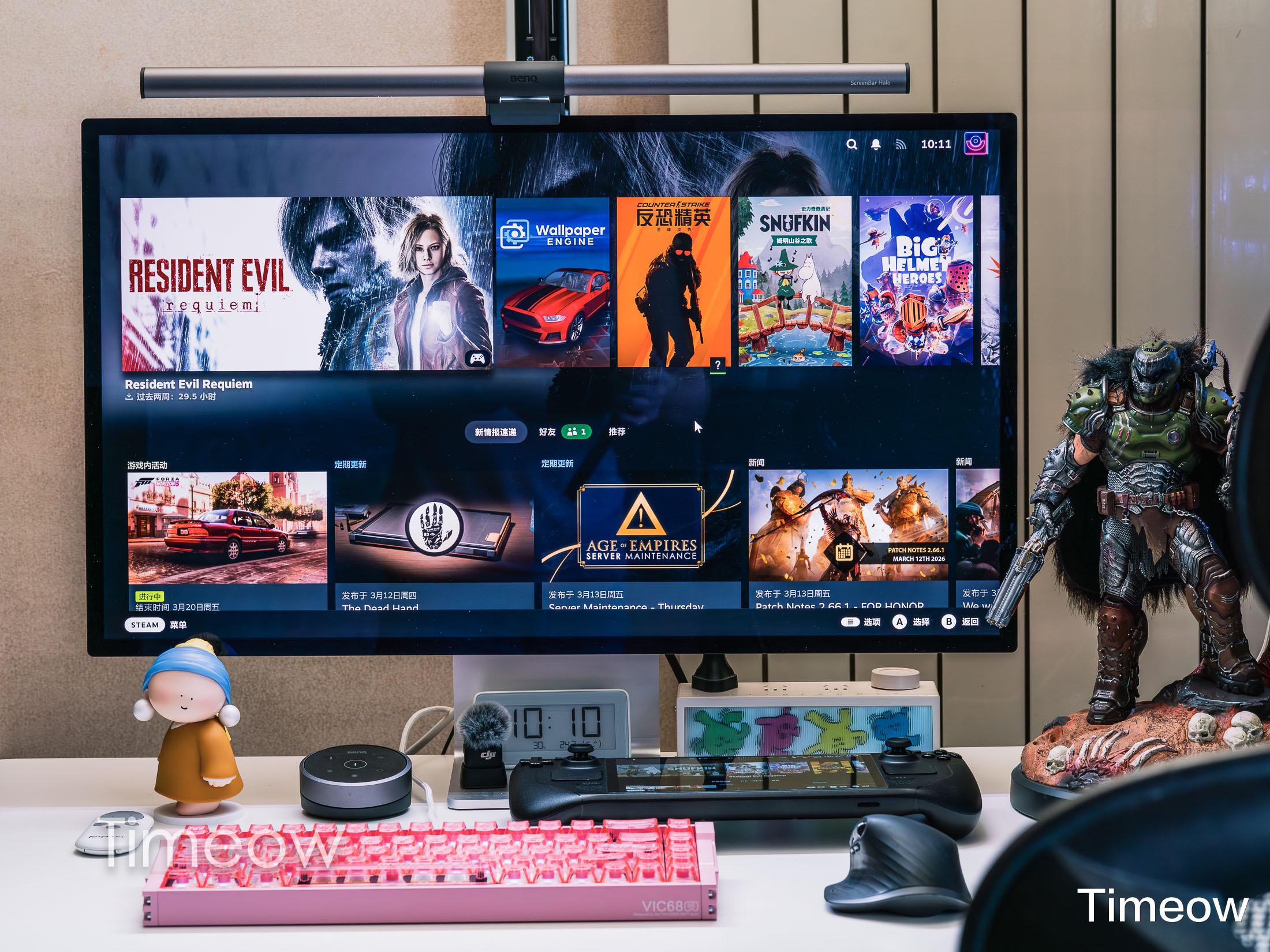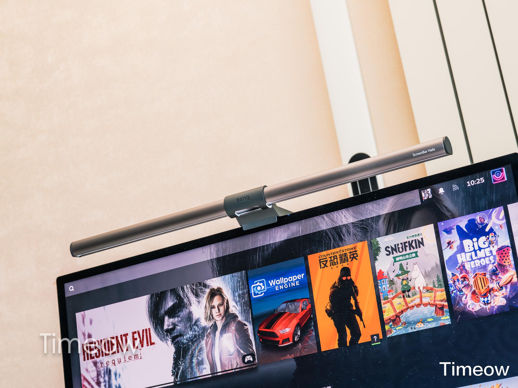 另外,显示器顶上挂的是明基ScreenBar Halo。这东西属于用了就回不去系列,夜里打游戏只照桌面不照屏幕,屏幕不反光,眼睛不累,背后的氛围灯开了之后也能减少明暗交替的疲劳感。这玩意我用过所谓的性价比平替,但就跟高端显卡一样,为了那么一点体验提升需要付出超多的金钱,不成比例但无可替代。