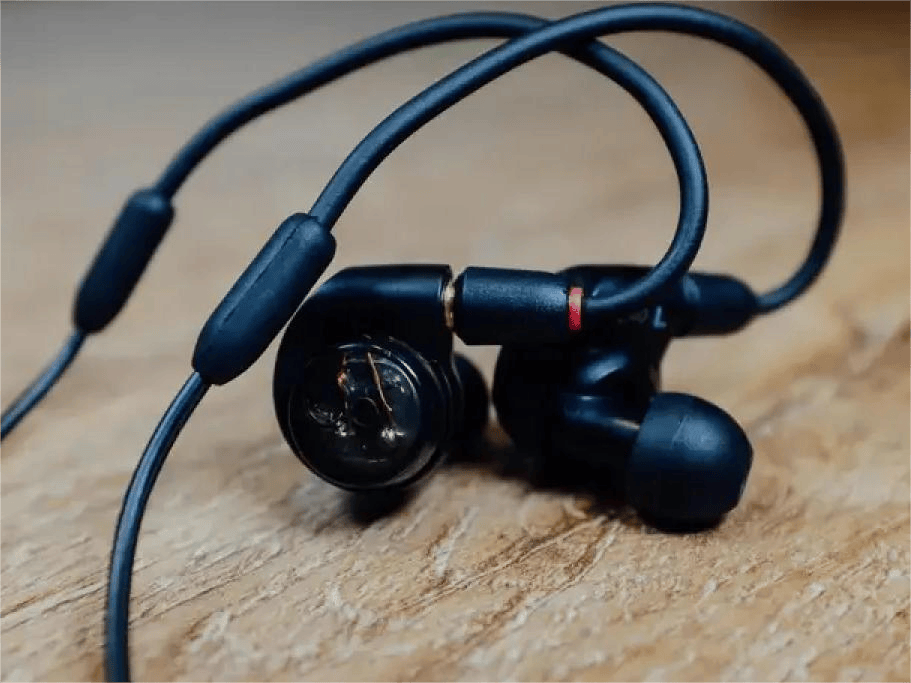ATH-E40 采用较为传统的入耳式造型,腔体为塑料材质,触感偏硬,但重量控制得不错,佩戴时不会有明显坠感。随机附带多种尺寸的硅胶耳套,尺寸覆盖齐全,不过耳套本身偏薄,贴合度表现中规中矩。搭配环形挂耳导线理论上能增强稳定性,但实际佩戴中仍有滑落的可能,长时间使用超过两小时后,部分耳廓会出现轻微压迫感。