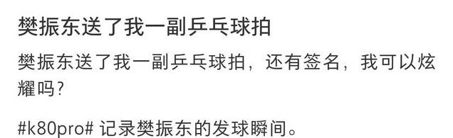 当时宣布樊振东为代言人后,老总雷军还忍不住在网上显摆了一番,并且还配文说:樊振东送了我一副乒乓球拍,还有签名,我可以炫一下吗?原来雷总也是樊振东粉丝啊。