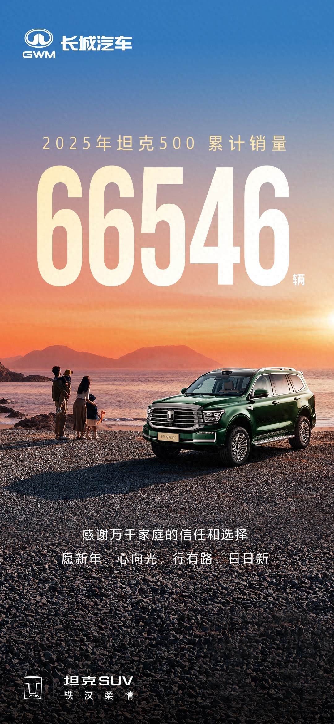 2025年全年销量66546辆是坦克500市场成功的重要里程碑,更是中国品牌高端突破的范本。在行业变革的浪潮中坦克500以技术底蕴为根、场景洞察为轴、文化自信为魂,构建起可持续的豪华价值体系。未来,坦克500将以豪华越野标杆之姿,继续开拓更广阔的市场疆域,引领中国汽车行业在全球豪华越野版图上全面布局。