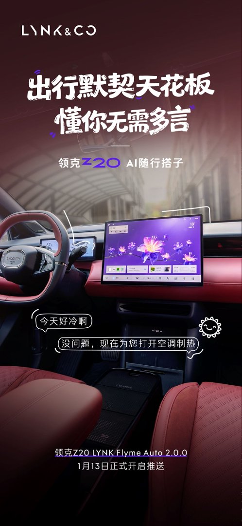 从基础功能的精细化优化到创新场景的落地应用,领克Z20LYNKFlymeAuto2.0.0版本OTA升级,充分展现了品牌“以用户为中心”的产品初心,以及持续迭代、不断进化的技术实力。此次升级不仅为现有车主带来了更智能、更开放、更具温度的出行体验,也为15万级纯电SUV市场树立了智能升级的全新标杆,让更多消费者真切看到了智能汽车全生命周期价值的无限可能。