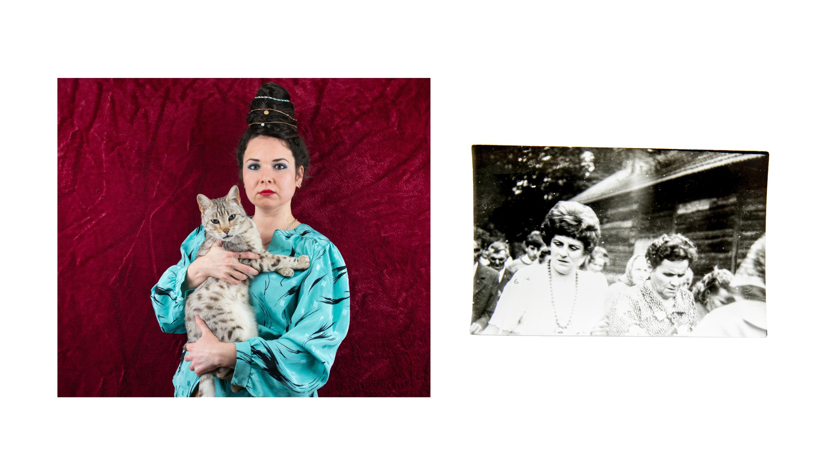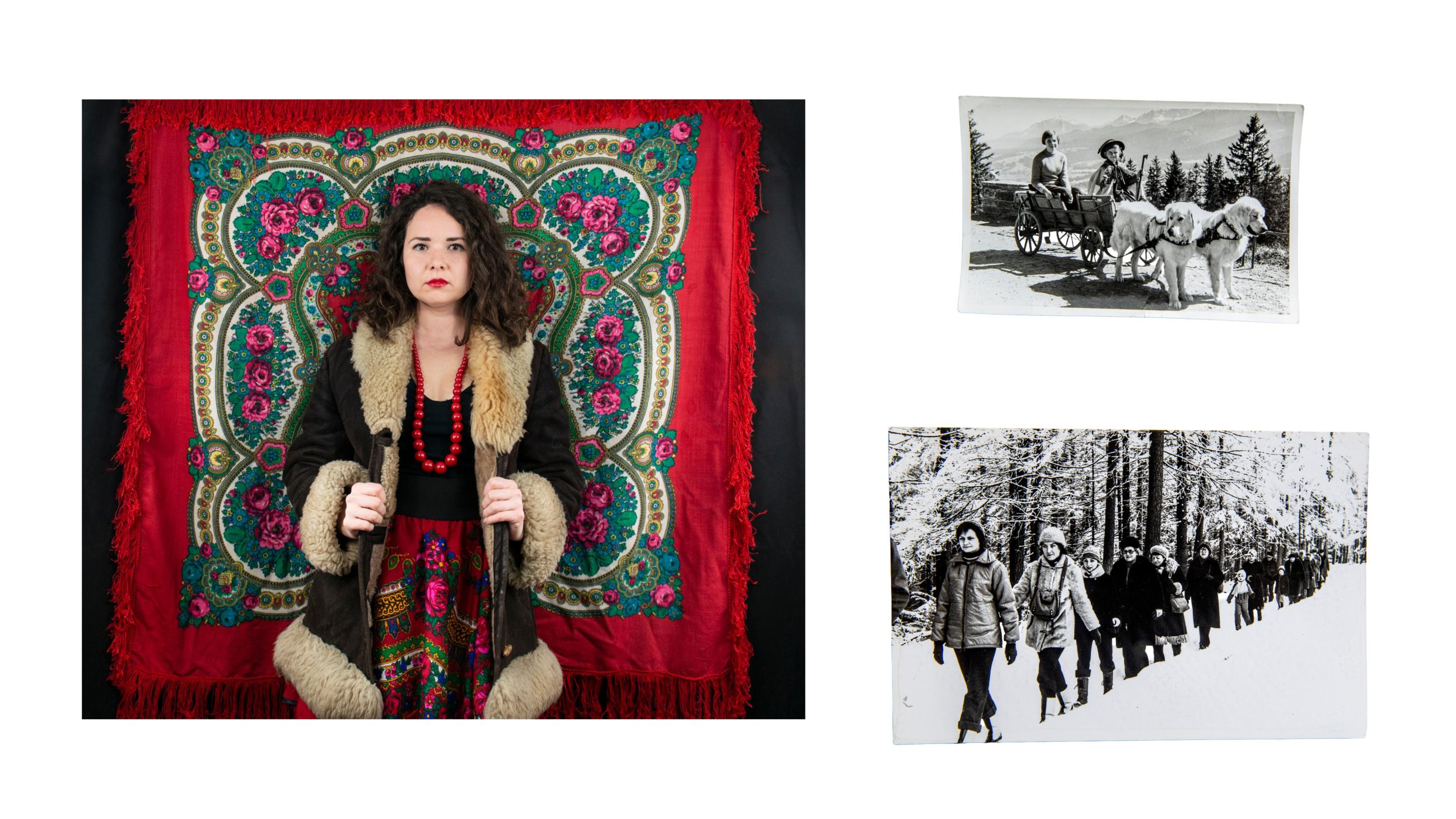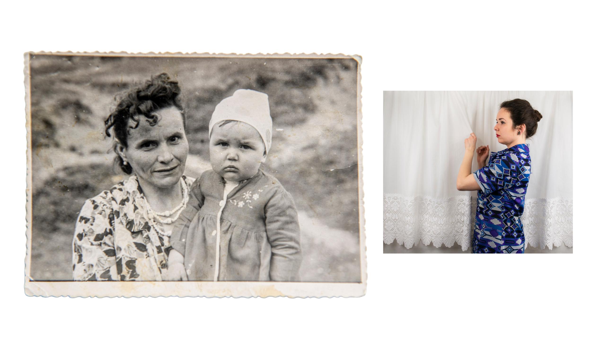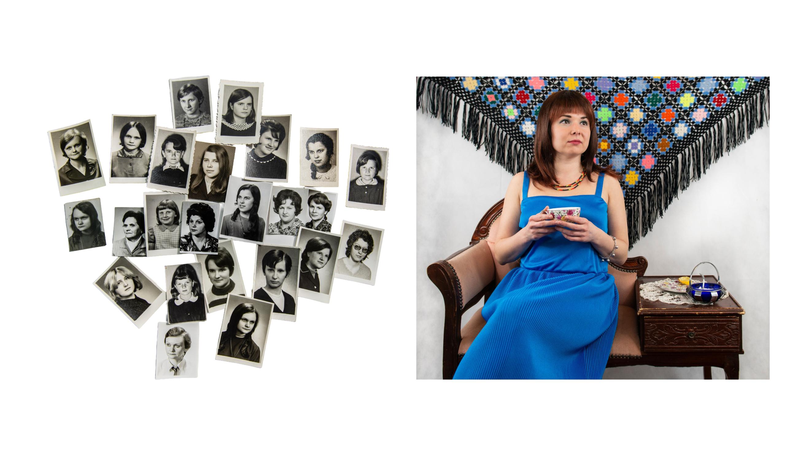 《成为她的故事》探讨了记忆、家庭和迁徙。摄影师在孩提时代从波兰移居至英国,背负着归属与距离之间的断裂。她将自拍照与女性亲属的档案照片并置,通过与传承下来的服饰和物品互动,追溯代际间的记忆。