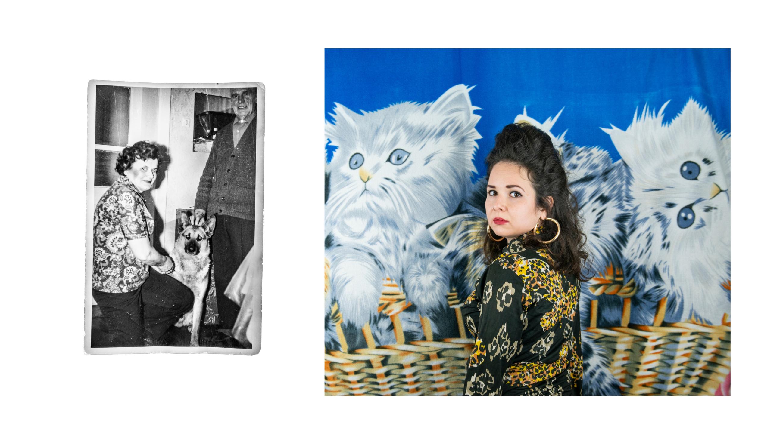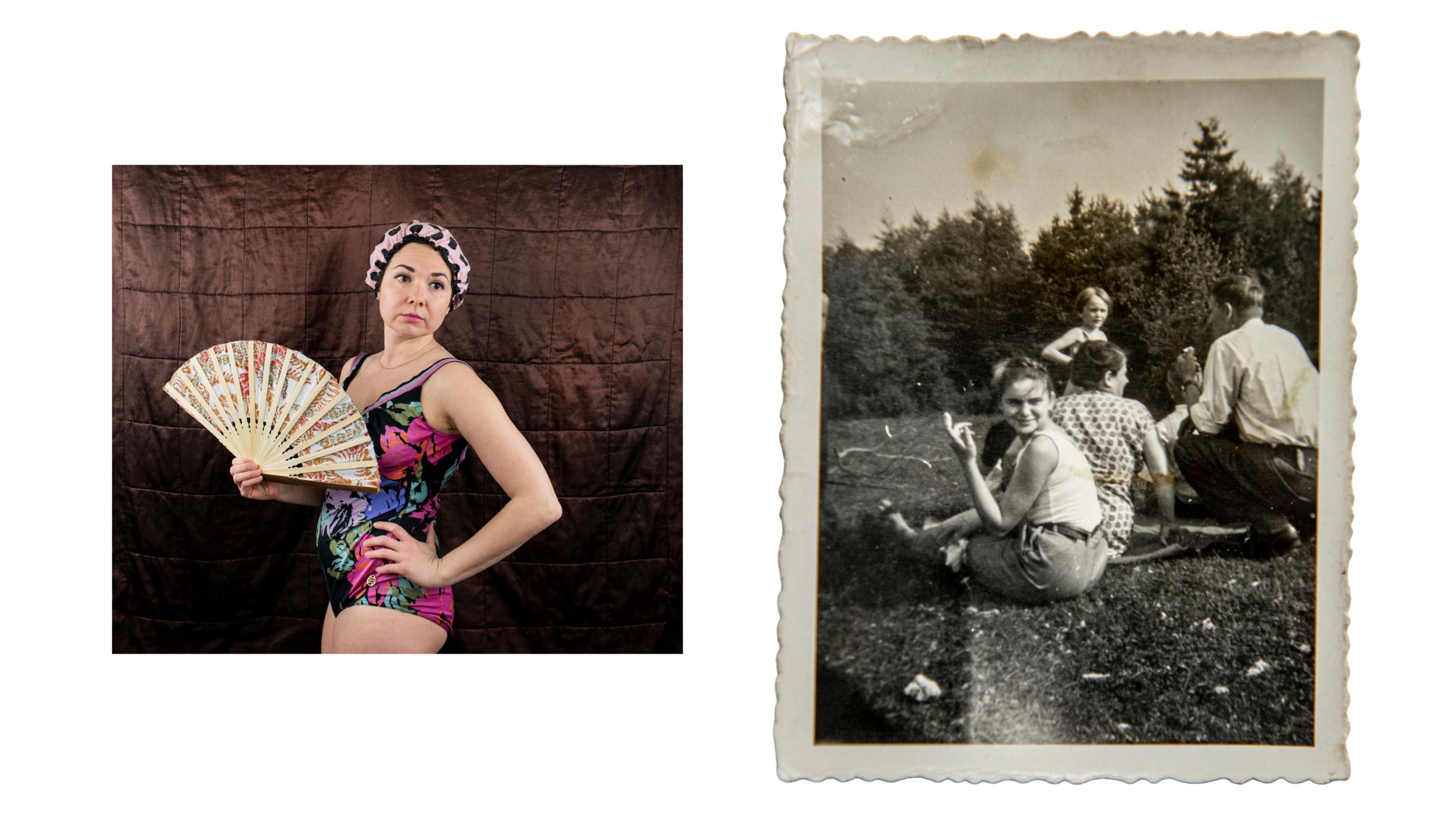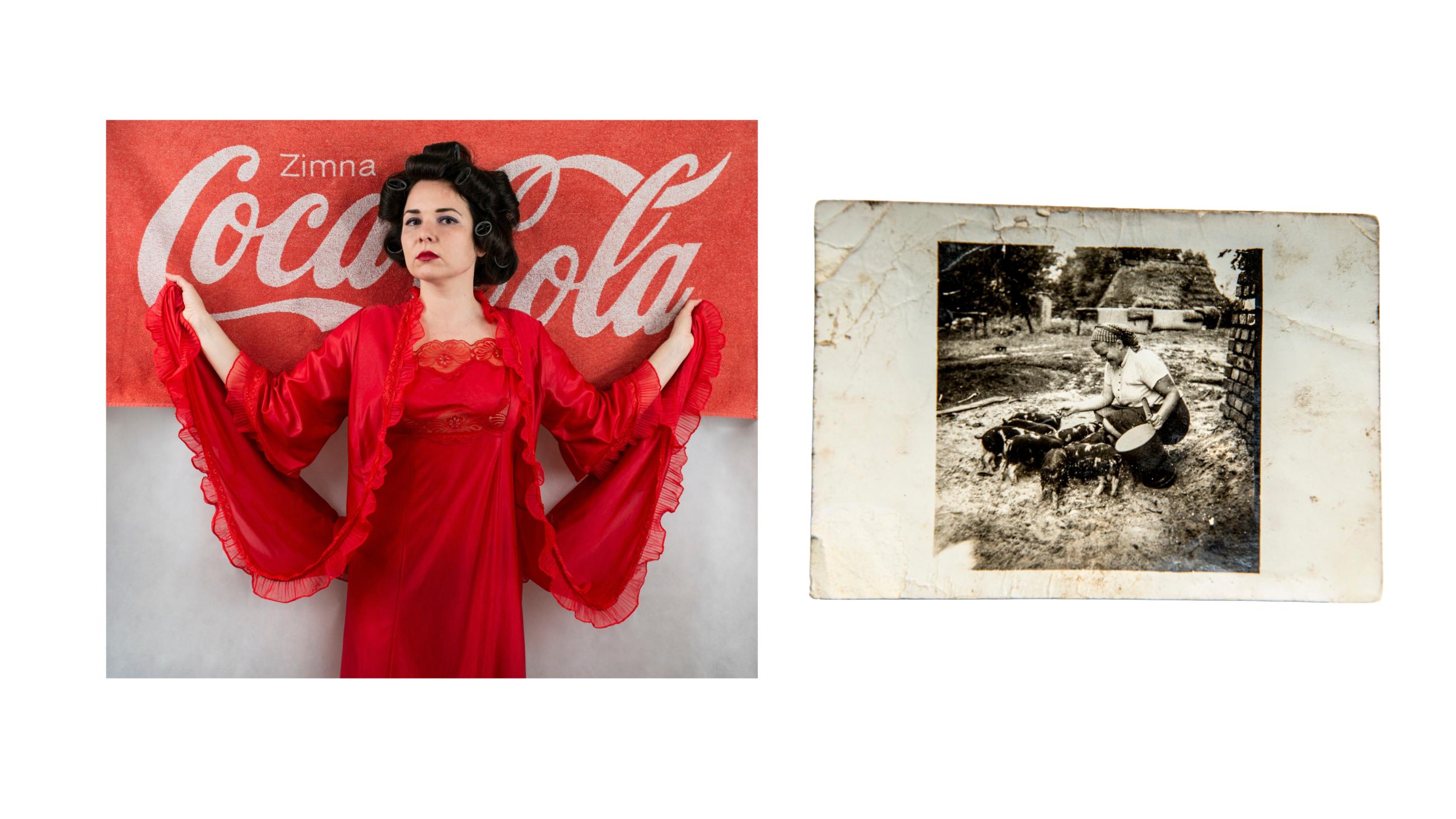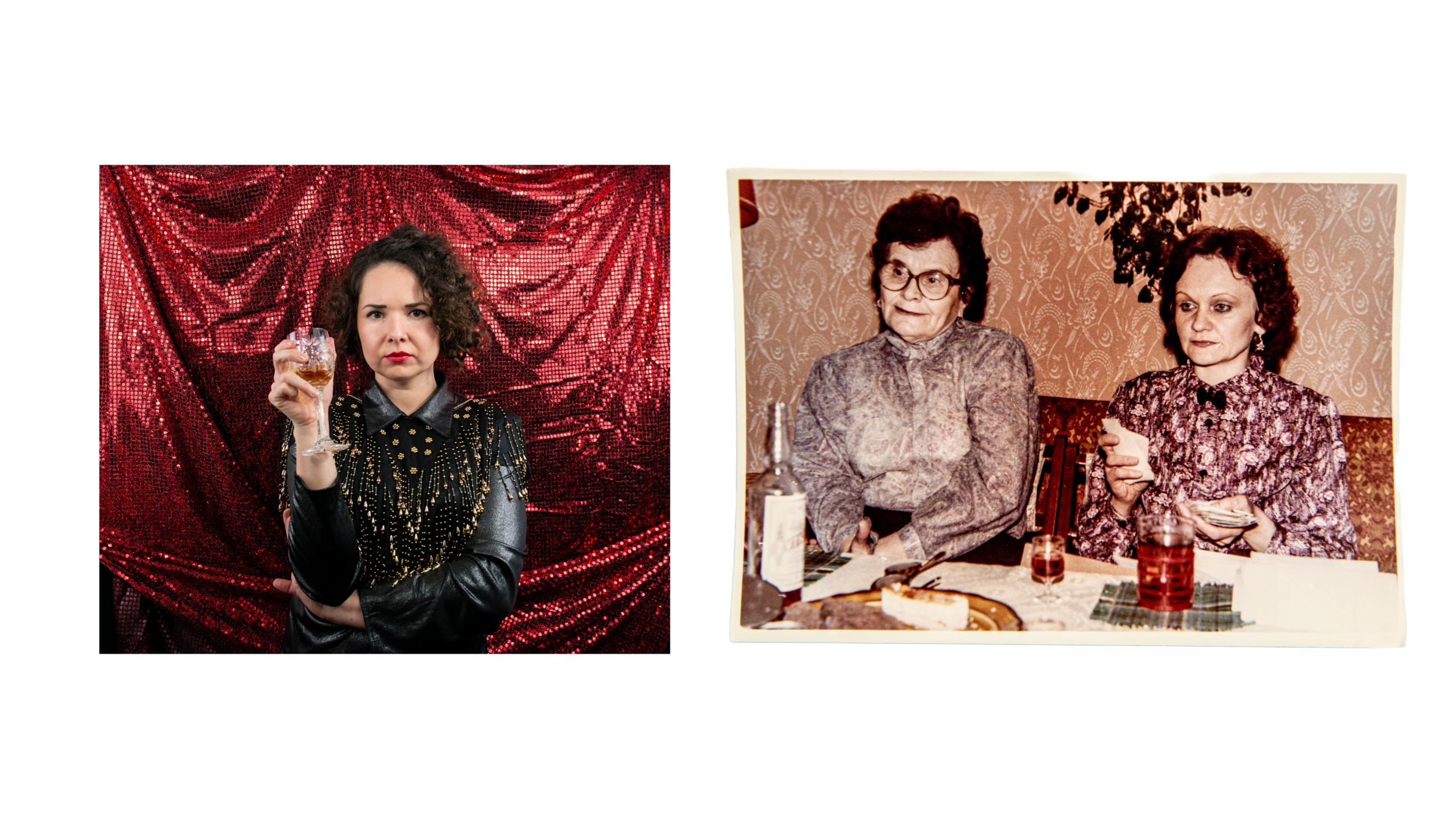 《成为她的故事》探讨了记忆、家庭和迁徙。摄影师在孩提时代从波兰移居至英国,背负着归属与距离之间的断裂。她将自拍照与女性亲属的档案照片并置,通过与传承下来的服饰和物品互动,追溯代际间的记忆。