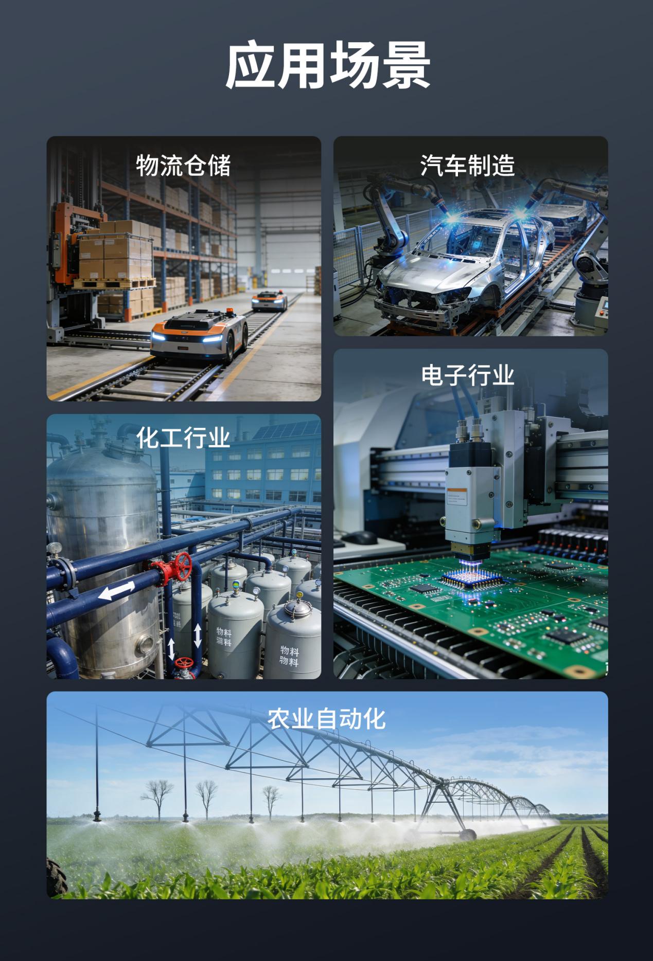 - 物流仓储:堆垛机定位、交叉带分拣机、输送线调速。