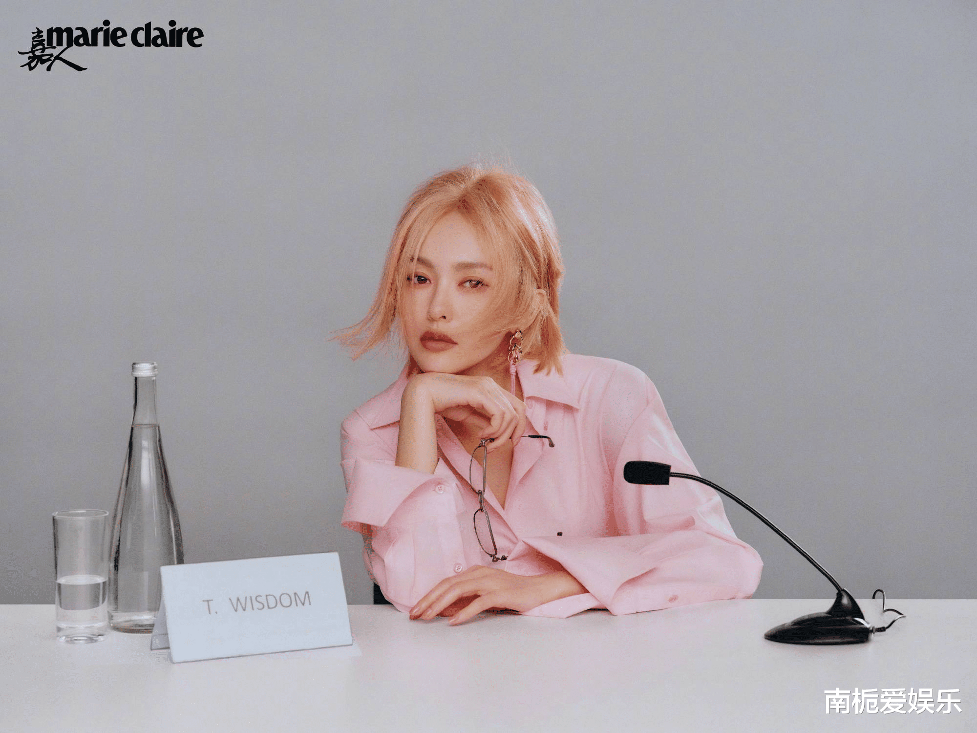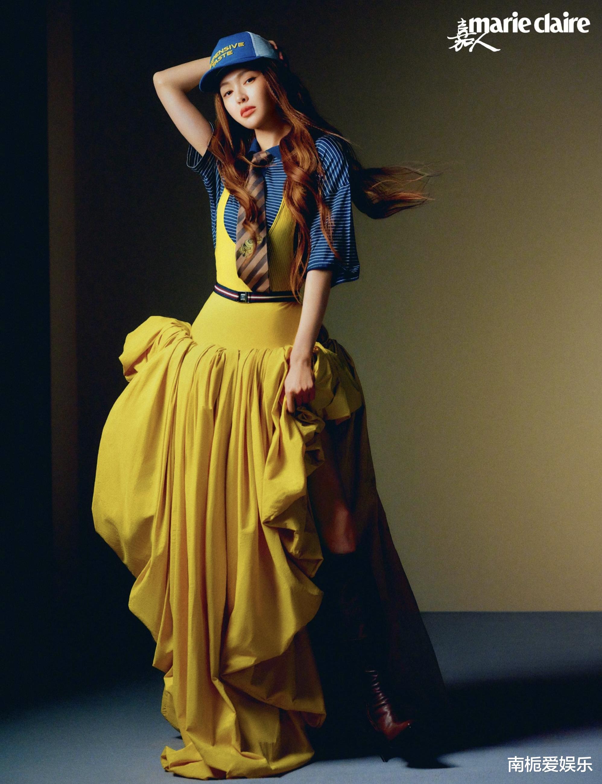这次封面大片的精华,在于唐嫣对“多面”这个词的完美演绎。封面造型中,冷白皮配上高饱和度的粉发,再架上一副半框眼镜,既有少女的明媚,又多了几分高级的智感,甜而不腻,娇而不嗲。内页里她更是换了七套风格迥异的造型:时而是干练利落的西装女强人,时而是慵懒随性的复古女郎,甚至大胆尝试了将外套当作抹胸穿的先锋穿法。其中一套爆炸头配红色长裙的造型,那份不受束缚的鲜活生命力,直接从照片里溢了出来。