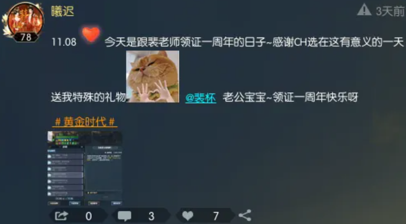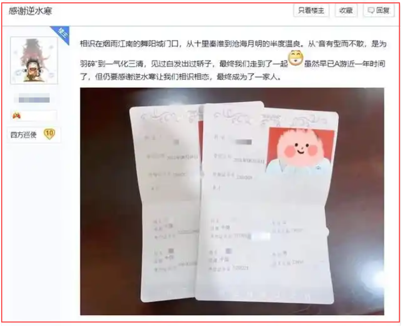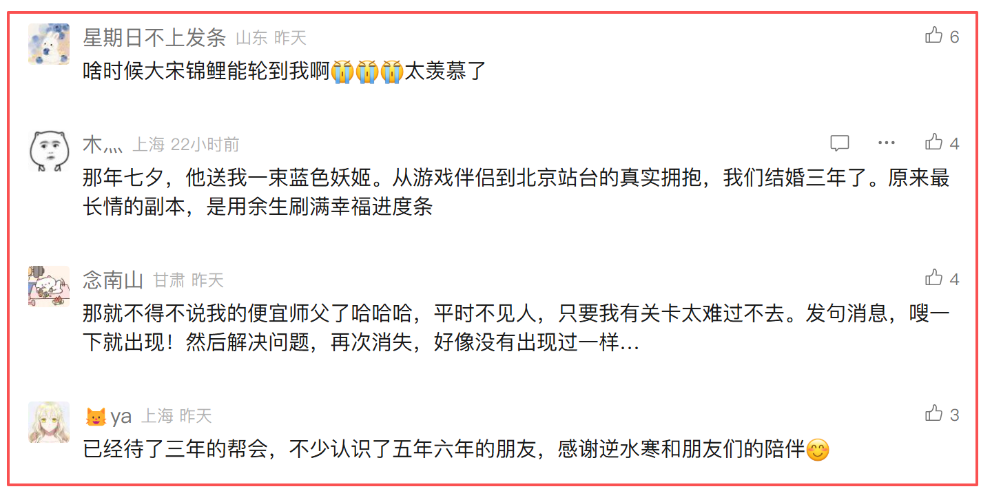 七年间,《逆水寒》如同一位靠谱的牵线者,不断撮合着线上玩家的现实情缘。有玩家分享“游戏师徒终成现实夫妻”的甜蜜日常,有情侣带着游戏中的定情信物拍摄婚纱照,甚至有不少新人因这款游戏结缘,一度让民政局出现热闹的登记场景。