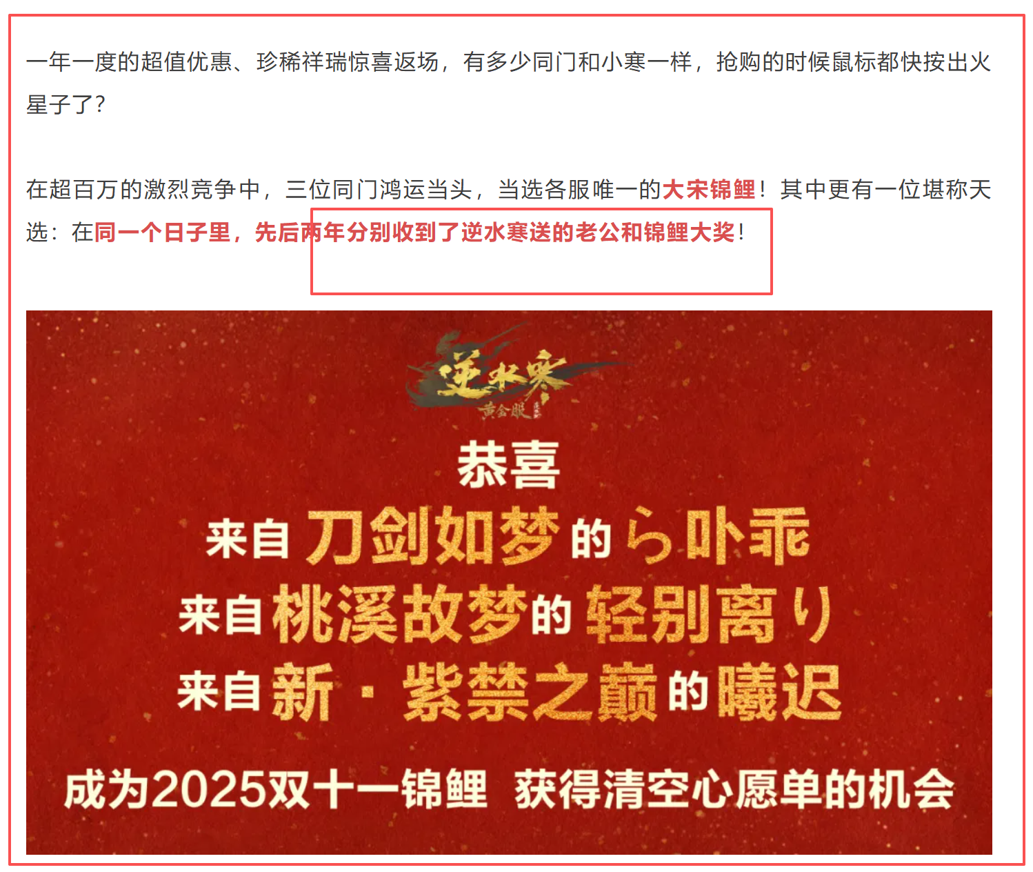 《逆水寒》向来以大方福利著称于业内。从东北1000亩黑土地到鹤岗的整套住房,再到玩家见面会包下深圳湾酒店,始终秉持豪放的福利风格。此次双11期间,游戏再次推出三项锦鲤大奖,获奖者均得到价值20余万元的元宝奖励,折合人民币超过2万元。