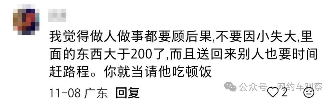 近日,一名广东网友称其在某平台上打了一辆网约车,下车约10分钟后发现自己的手机遗落在车内。于是她通过朋友手机与司机取得联系,司机称正在接单,把手机送回来的经济损失将近100元。