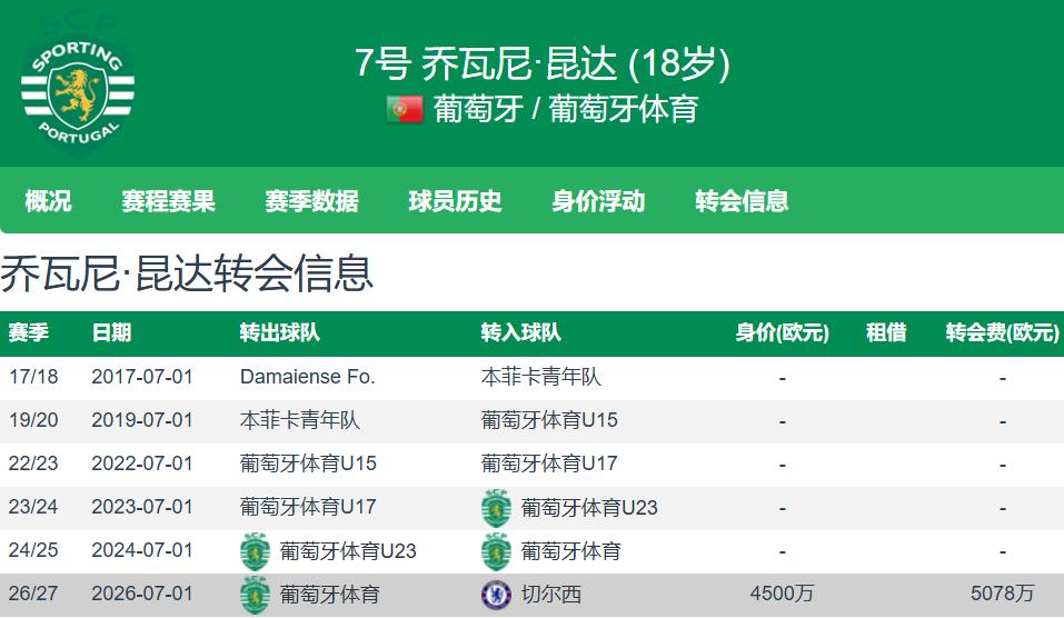 切尔西已经于今年3月与葡萄牙体育达成协议,将以5078万欧元的转会费签下这位葡萄牙小妖,昆达本赛季继续留在葡萄牙体育踢球练级,球员将于本赛季结束后,也就是明年夏天与切尔西会合,参加季前赛以备战2026-27赛季。昆达出自本菲卡青训,之后转投葡萄牙体育,已经打破多项纪录,比如超越C罗成为葡超最年轻进球者,以及葡萄牙体育最年轻的欧冠进球者。昆达有个赛季的助攻数据甚至优于C罗、菲戈、纳尼三大葡萄牙传奇的处子赛季表现。