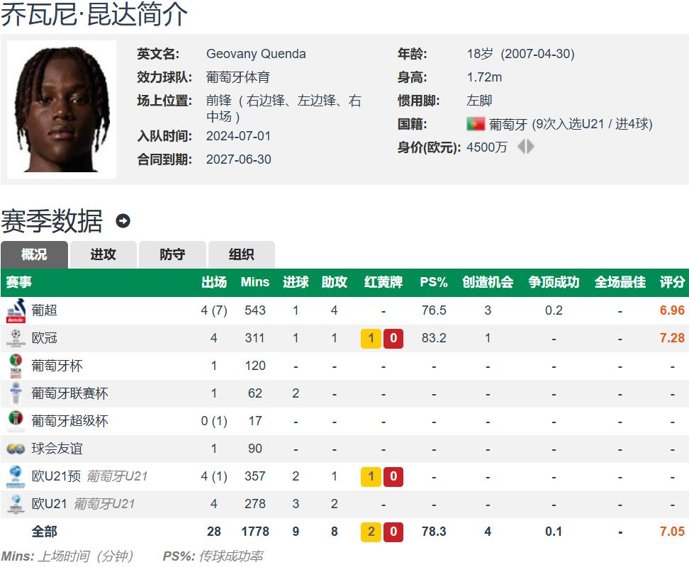 昆达现年18岁,身高1.72米,左脚球员,主打右边锋位置,也可以踢左边锋和右中场,德转估价4500万欧元。昆达本赛季至今各项赛事共为葡萄牙体育出场18次,其中10次首发,贡献4球6助。