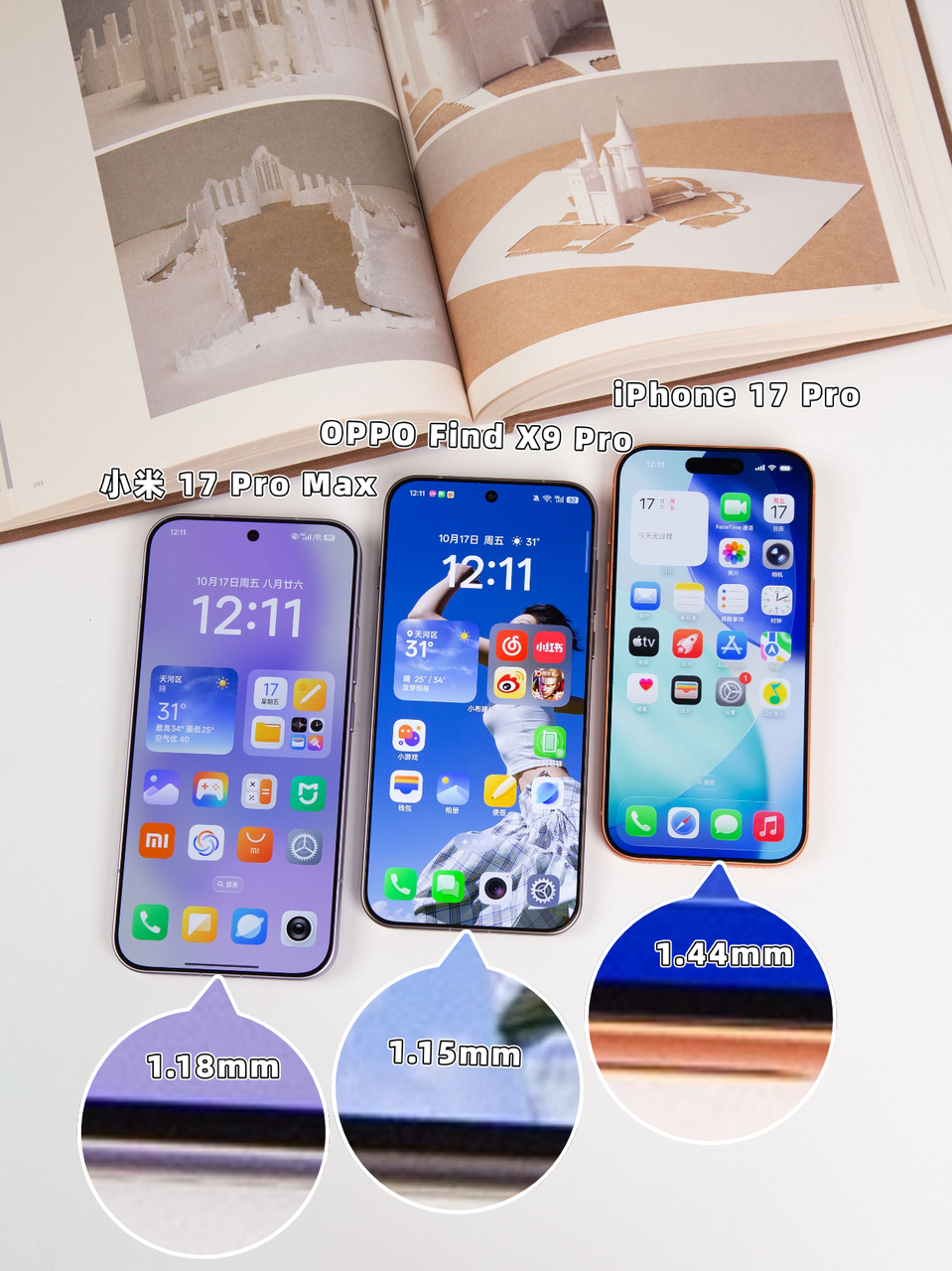 值得买的手机千千万,但是窄到只有1.15mm的就只有这台了。OPPO Find X9是真的“卷到没边”,相比iPhone 17 Pro(1.44mm)、小米17 Pro Max(1.18mm)等竞品视觉上更惊艳,搭配过渡适中的R角,屏幕观感真的很上头,非常推荐去线下真机感受一下。