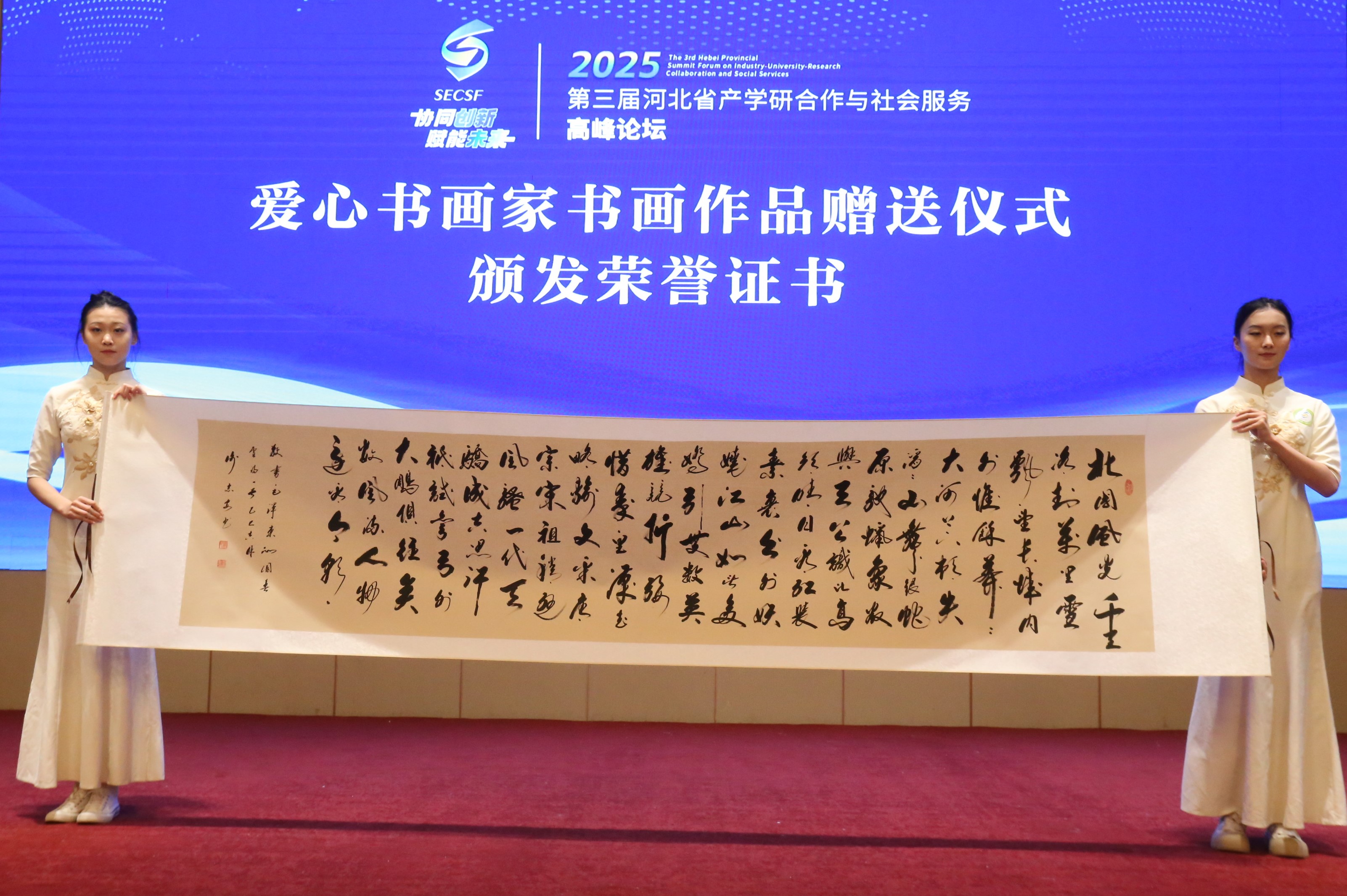 尾声,庞玉琪、张三、朱曼霞、张永庆、谢志安、董广英、赵九凌、李凤梅、范新喜爱心书画家向论坛组委会赠送书画作品,组委会秘书长王俊昆为书画家颁发荣誉证书,名书画家们以文化赋能的形式为本次产学研交流活动增添了人文温度。