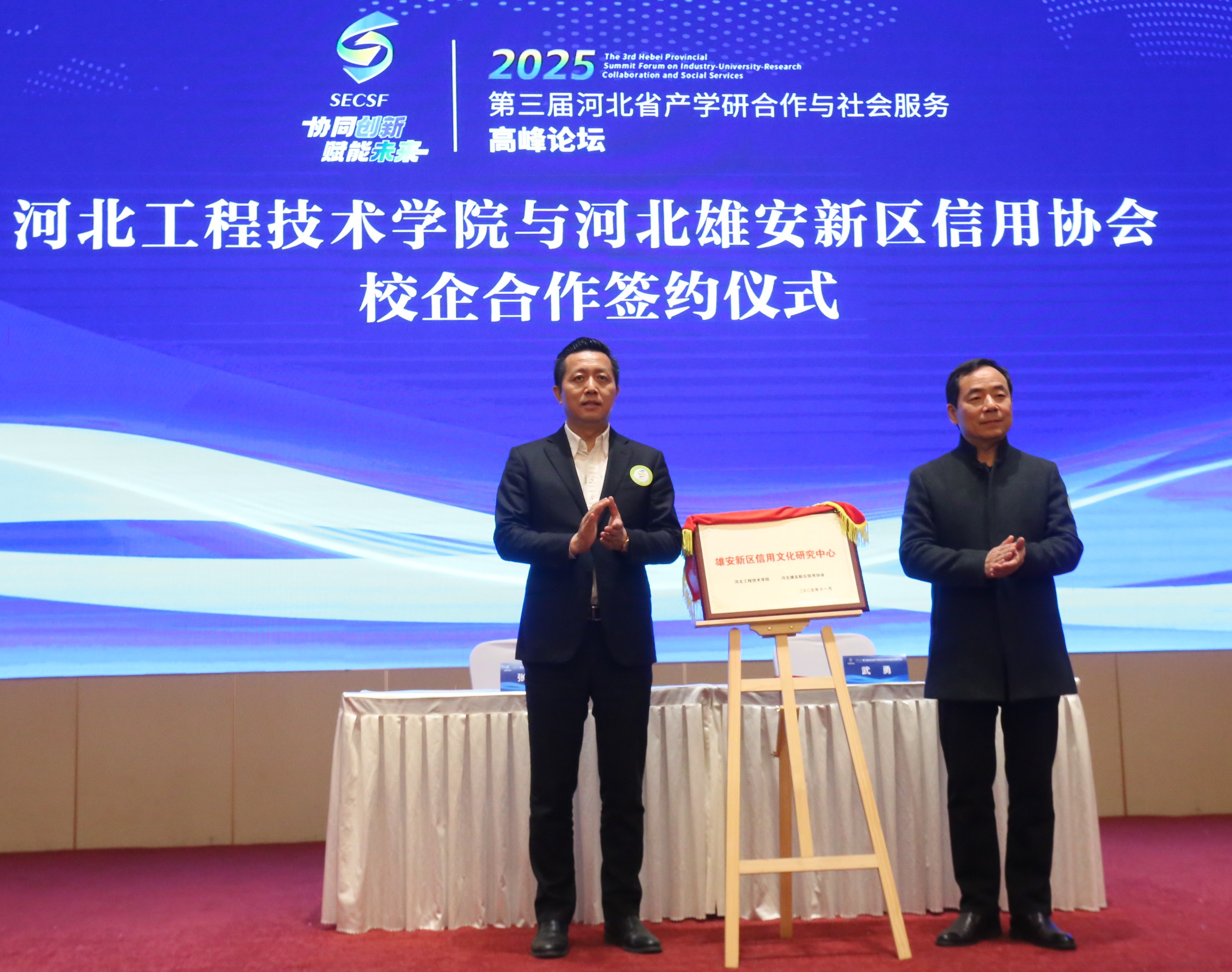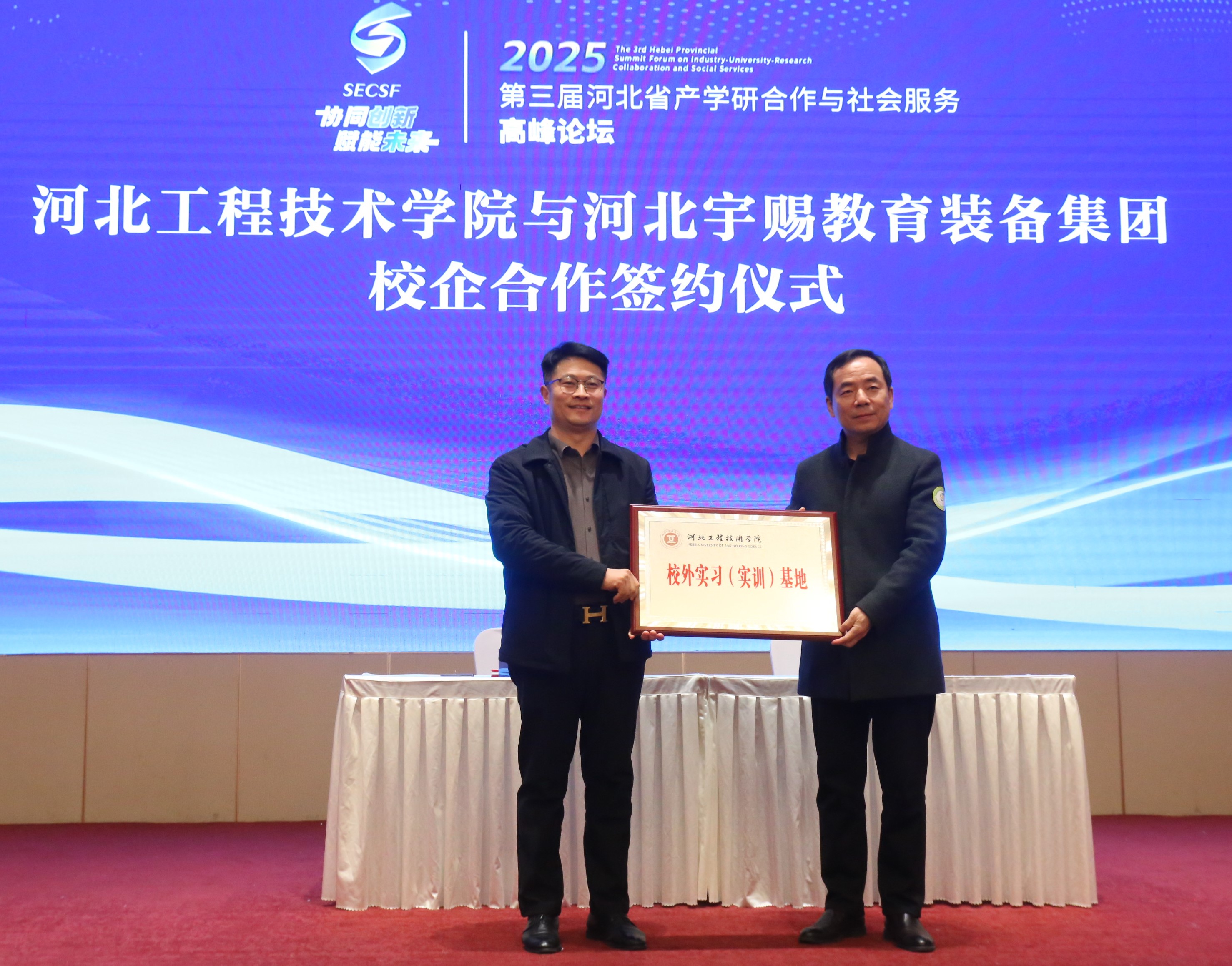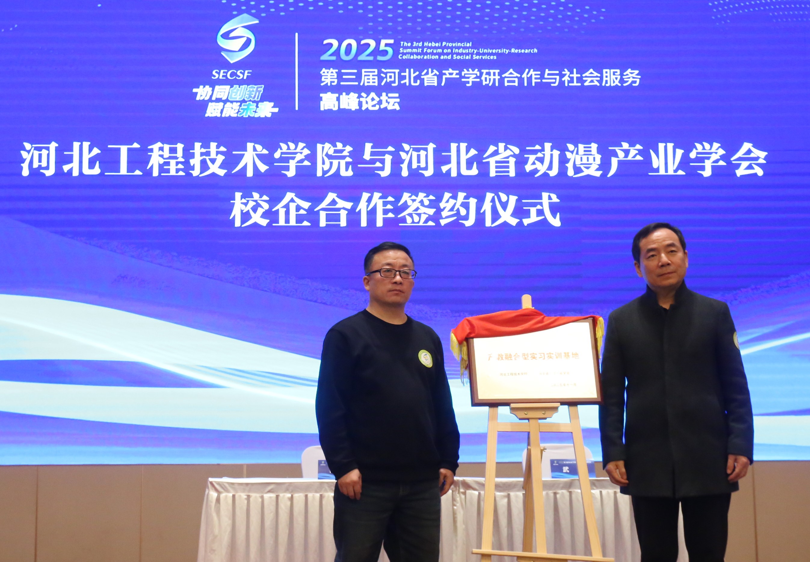 项目签约授牌仪式成为论坛的重要亮点。河北工程技术学院分别与河北雄安新区信用协会、河北省动漫产业学会达成战略合作,为共建的“雄安新区信用文化研究中心”“产教融合型实习实训基地”揭牌,标志着高校与特定领域行业协会的合作进入实质性推进阶段;同时,该校还与河北宇赐教育装备集团有限公司、河北向智农业科技有限公司签订校企合作协议,并为两家企业颁发“校外实习实训基地”牌匾,进一步夯实了产教融合的实践载体。