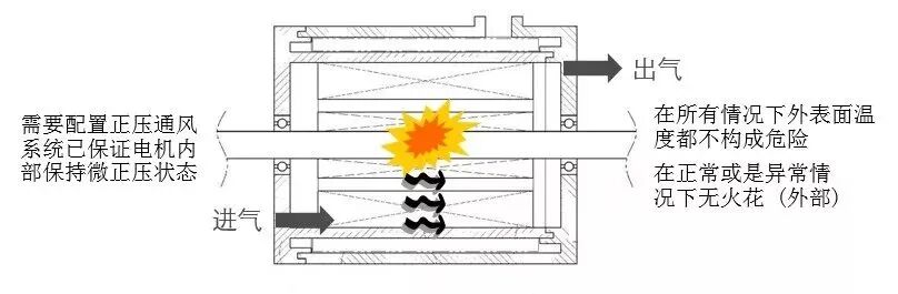 增安型防爆电机(Ex e)设计理念为:将原本所有可能点燃可燃性气体的部件都被制造为不可能导致气体爆炸。