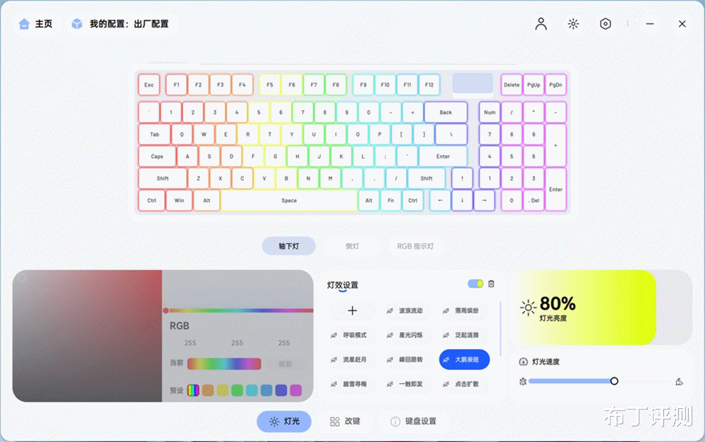 进入驱动界面,拥有灯光、改建和键盘设置共3大功能,可以方便用户对键盘进行各种设置操作。其中“灯光”界面能分别对轴下灯、侧灯和RGB指示灯进行各种设置,“改建”界面可能对键盘按键功能重新定义和设置,“键盘设置”界面能进行USB回报率、固件更新、接收器固件升级等操作。