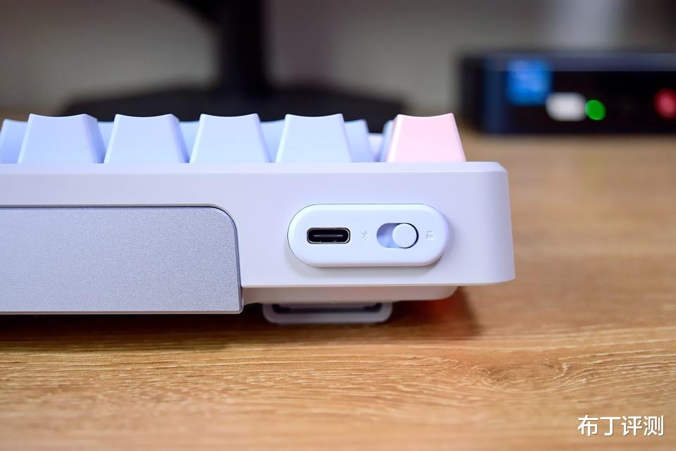 键盘的按键和接口被集中放在了后端左侧位置,拥有Type-C接口和模式切换键,通过快速滑动模式切换键即可快速切换连接模式,支持蓝牙5.0、无线2.4G和有线三模连接,还能在最多5台设备之间快速切换,轻松满足用户的不同使用需求。