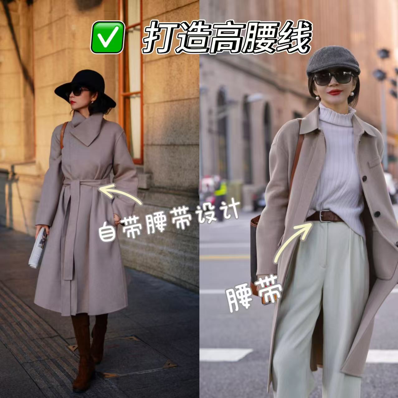 对于任何身高的人来说,腰线都是塑造好比例的关键,尤其是当你穿着容易压个子的长大衣时。明确的高腰线能瞬间重塑你的身材比例,打造出"三七分"的视觉效果,这是显高显腿长的核心。