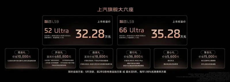 更震撼的是,智己LS9上市权益诚意爆棚,将奢华B&O音响系统、二排右侧4D机械按摩、一体式超广域智慧探射灯、豪华智能电动踏板等旗舰豪华配置,统统限时免费升级!新车震撼发布两个超级增程版本:智己LS9 52 Ultra版上市权益价32.28万元,入门即巅峰,以30万出头的价格,享受时代最旗舰的满配大六座;智己LS9 66 Ultra版,更搭载66度宁德时代超级骁遥MAX电池,将续航和性能推向极致,上市权益价35.28万元,一锤定音30万级最强旗舰爆品。