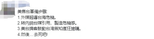 另有网友列出美售台军售的套路:“1.外媒报道台海危机;2.转内销台媒引用,制造危机感;3.美台掮客鼓动台湾无知疯狂抢购;4.然后……去死吧!”更有网友批评“前面收了钱还欠多少武器没给啊!不要脸的美帝就拿合约要钱,货什么时候给随他!有这种买卖啊!只有白痴民进党吧!又来骗钱!”