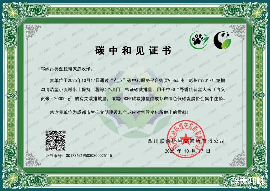 在全国推进农业绿色转型的背景下,邛崃市交出了一份务实而创新的答案——推出全国首款带产品碳标签的“碳中和”大米“冉义贡米”。该产品由邛崃市鑫磊耘耕家庭农场与四川国碳科技有限公司联合打造,并已完成从种植、加工到包装的全生命周期碳足迹核算,同步获得碳足迹标签、碳中和标签及权威机构颁发的碳中和见证书。