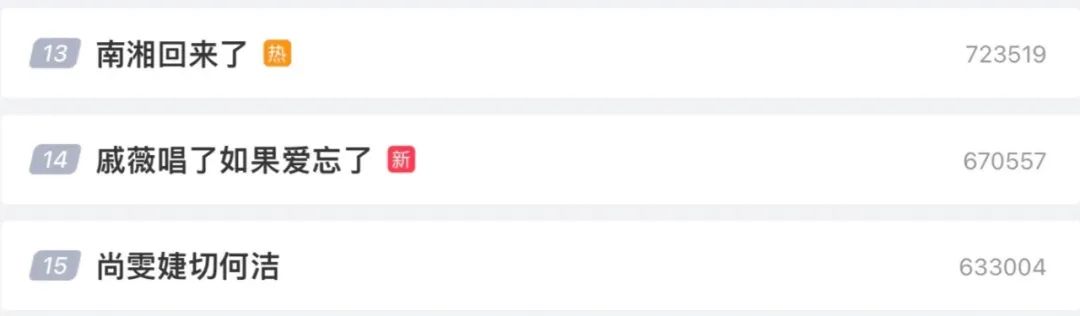 首播热度就达到了巅峰,#南湘回来了# #戚薇唱了如果爱忘了# #尚雯婕切何洁#等词条纷纷登陆微博热搜,又是“浪姐”霸榜的一天。